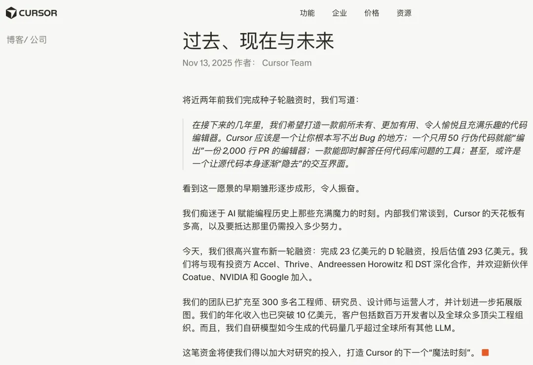 在这个背景下,Cursor能够拿到比同赛道竞争对手高出一个数量级的融资,说明资本市场对其差异化价值和护城河有更高的认可。