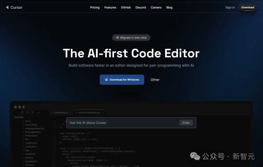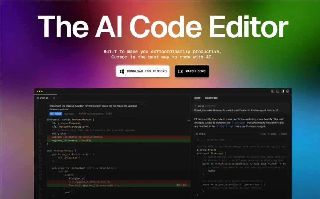 Cursor的定位是AI原生集成开发环境(AI-native IDE)。它不是把AI功能附加到一个已有的IDE上,而是从底层架构开始,就围绕AI辅助编程重新设计了整个开发环境。这和传统的”AI代码补全插件”(如GitHub Copilot)是两个完全不同的产品形态。