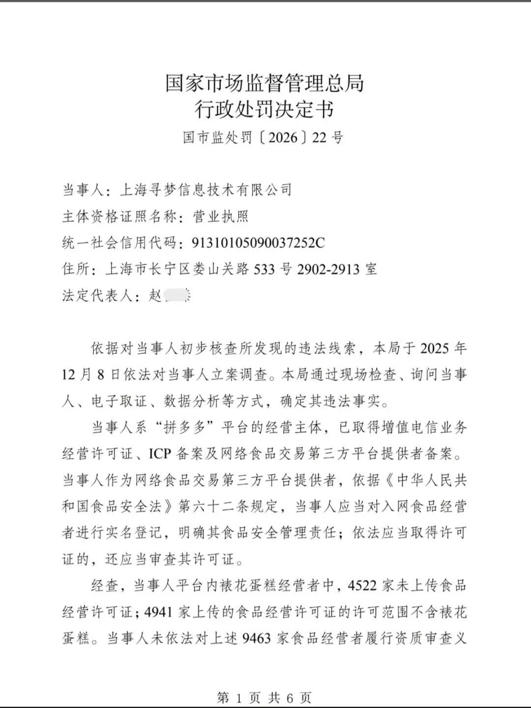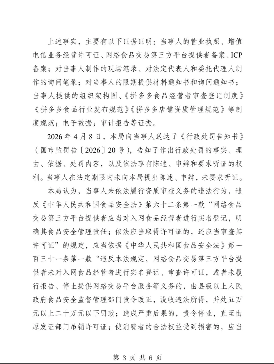2026年4月,国家市监总局向拼多多开出15.22亿元天价罚单,创下国内电商食品安全监管处罚纪录。