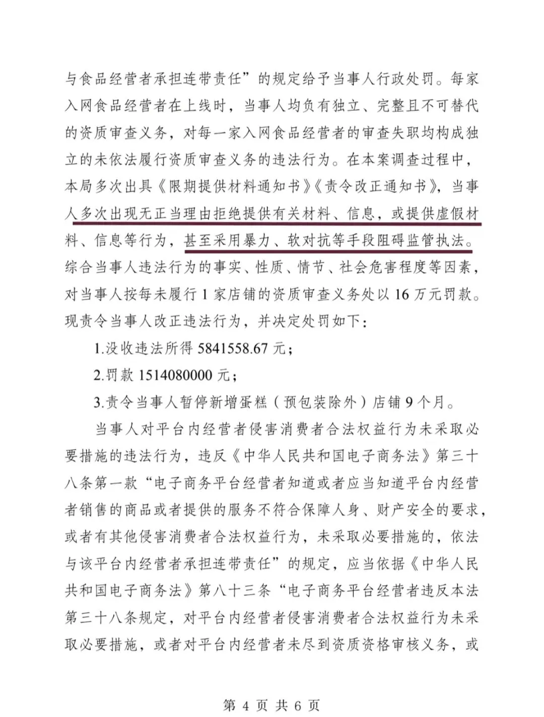 此次处罚直指两大违规:平台未对9463家裱花蛋糕店铺履行资质审查义务,涉及交易额近10亿元;且明知商家通过第三方平台违规“转单”侵害消费者知情权,却未采取管控措施。调查期间,平台多次拒绝配合、阻碍执法,最终被顶格处罚。