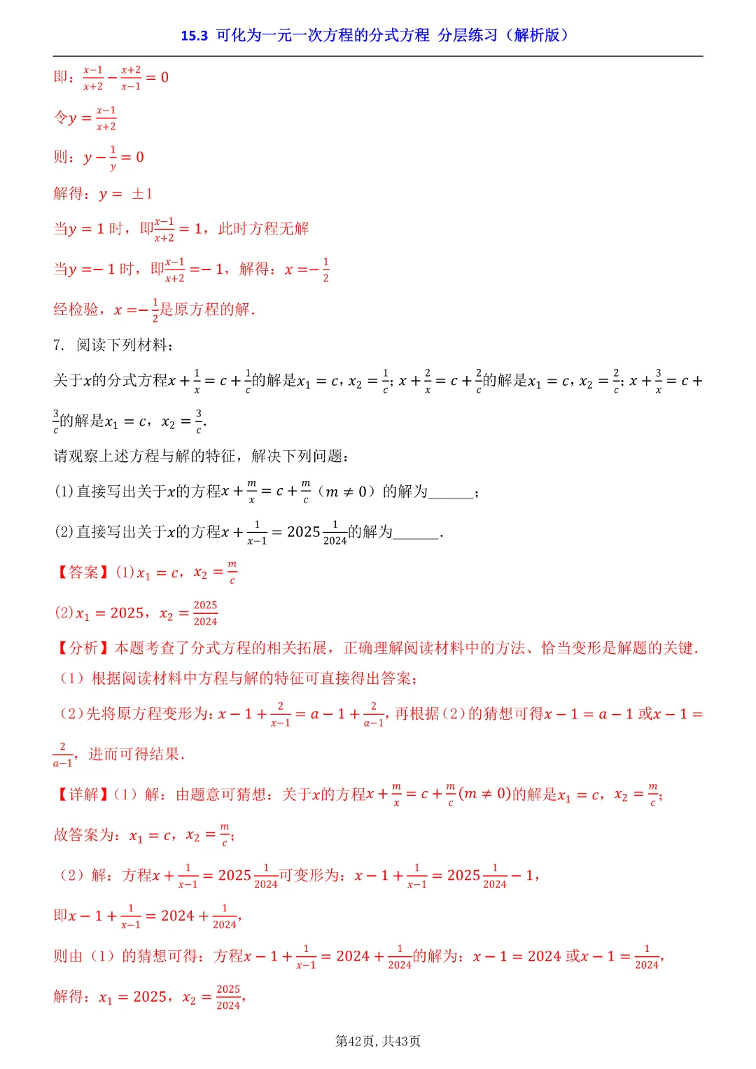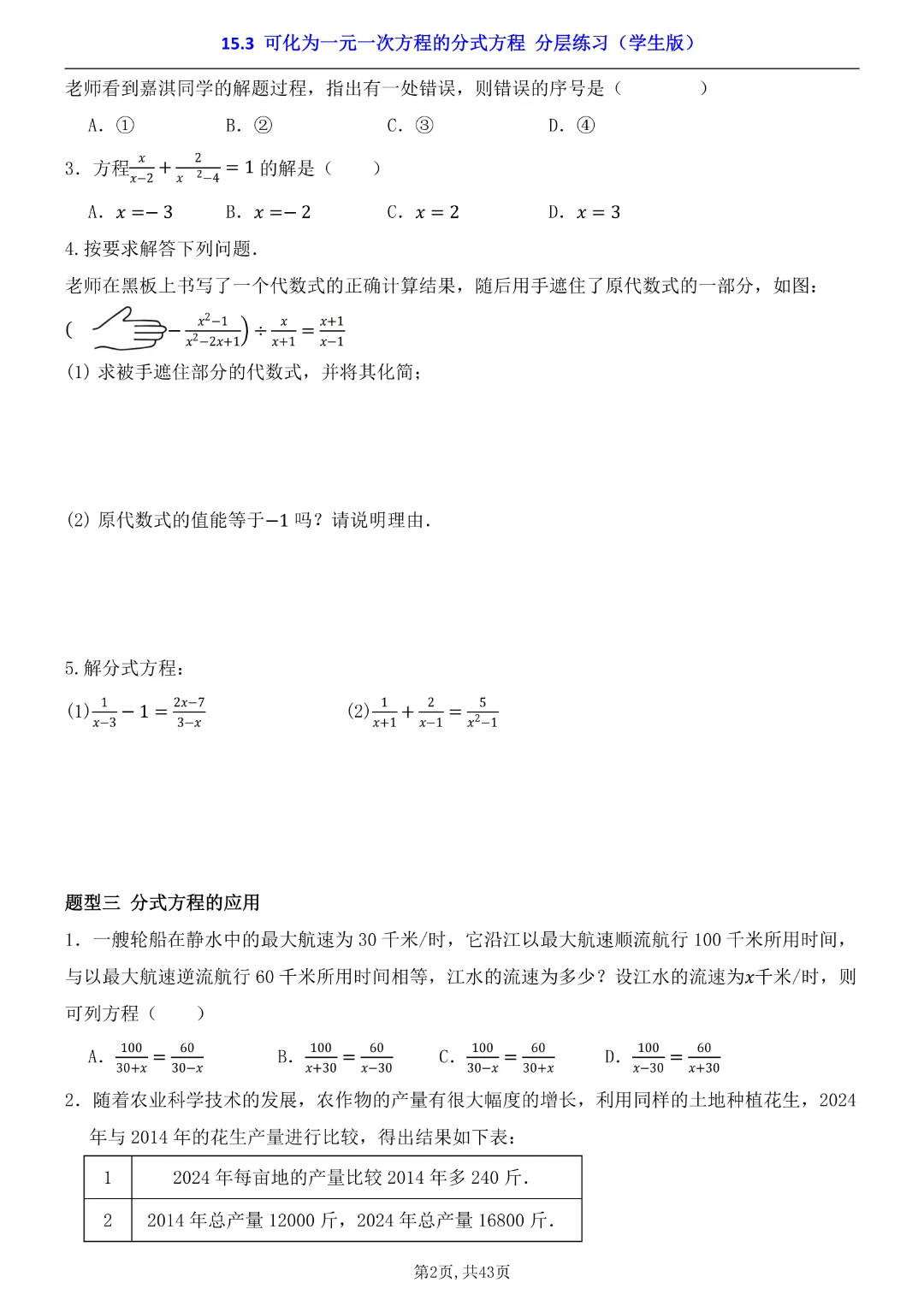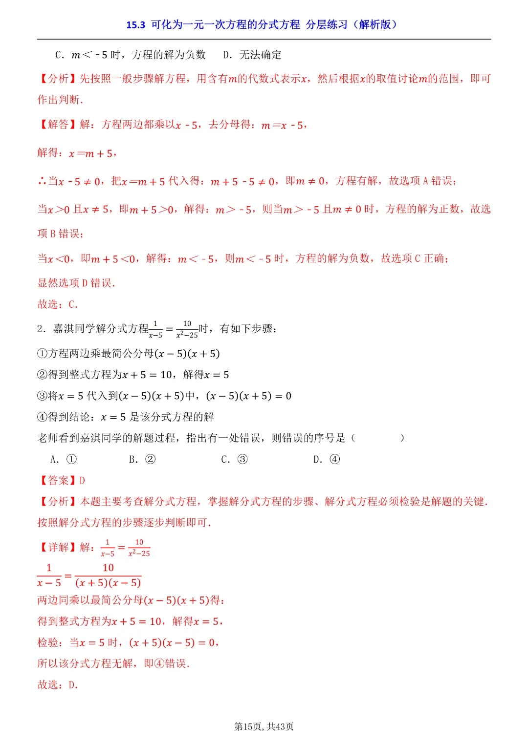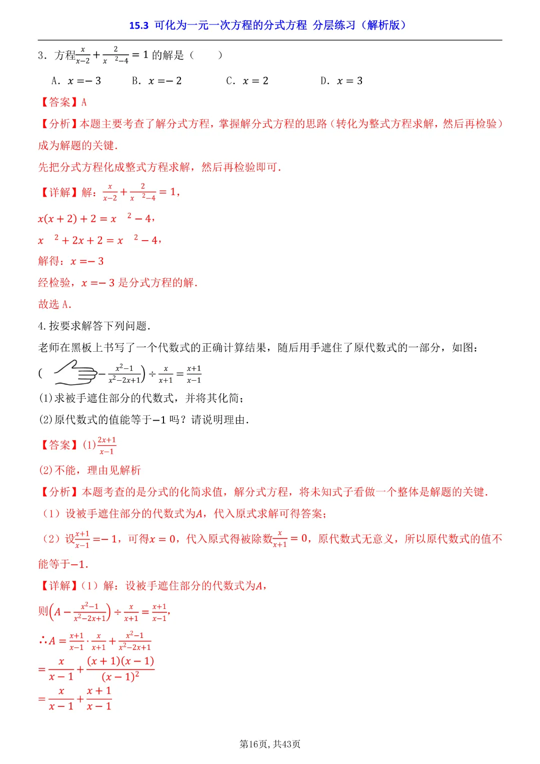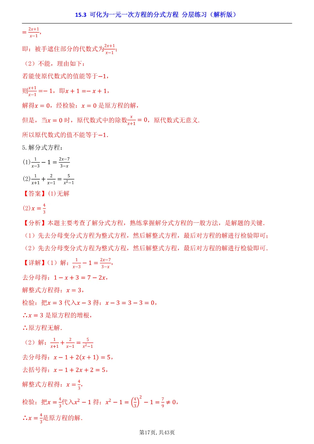 2026年八年级下册数学【15.3 可化为一元一次方程的分式方程 分层练习附解析】(华东师大版)高清电子版可打印