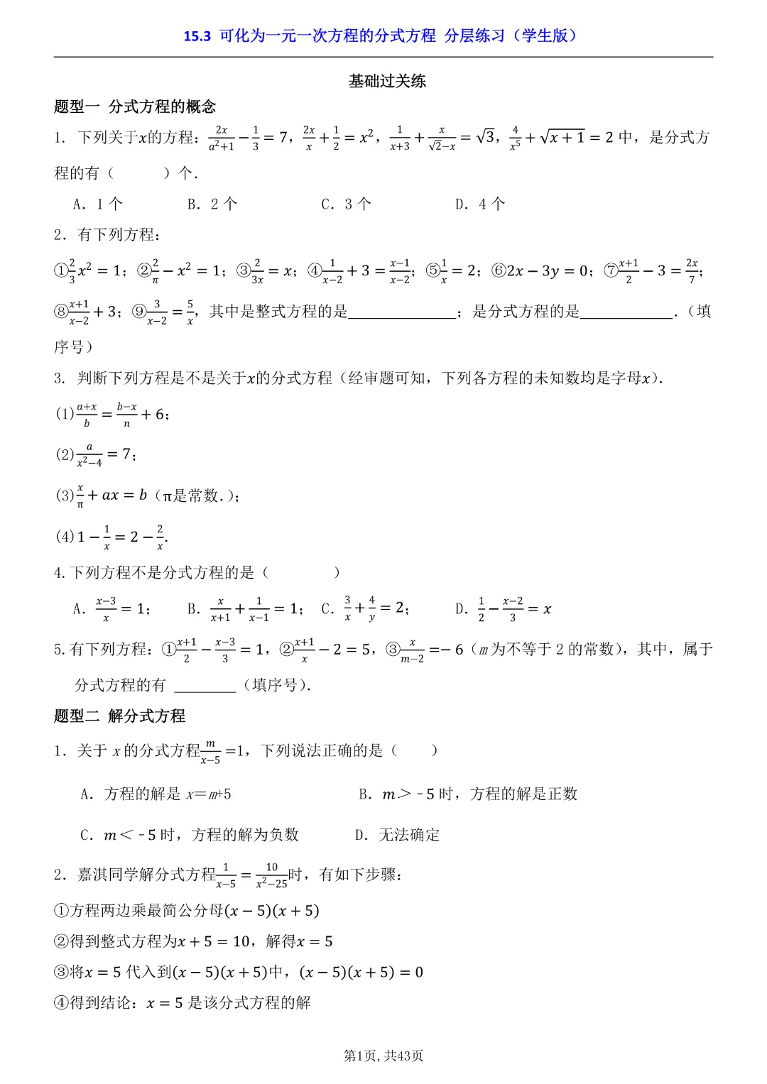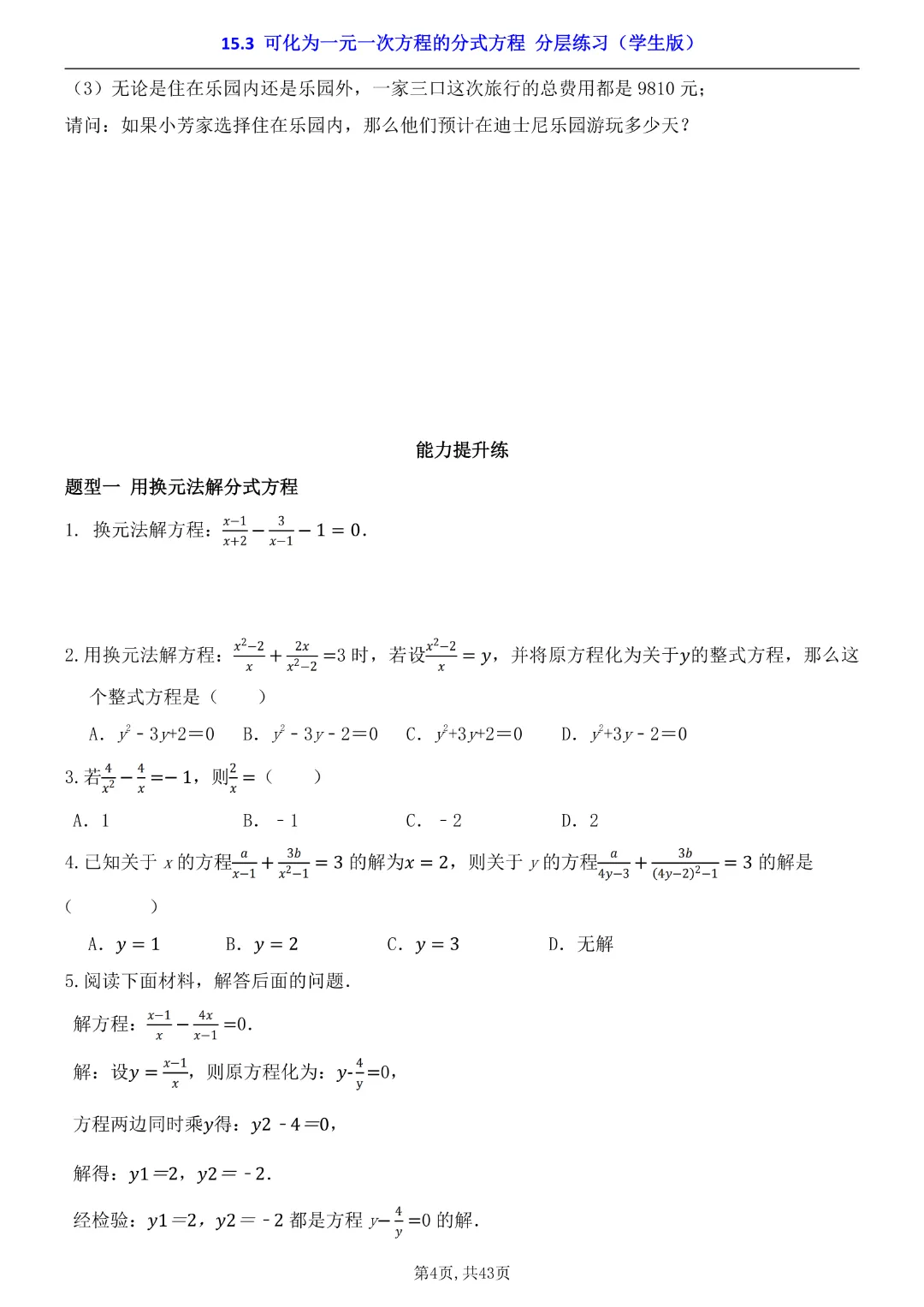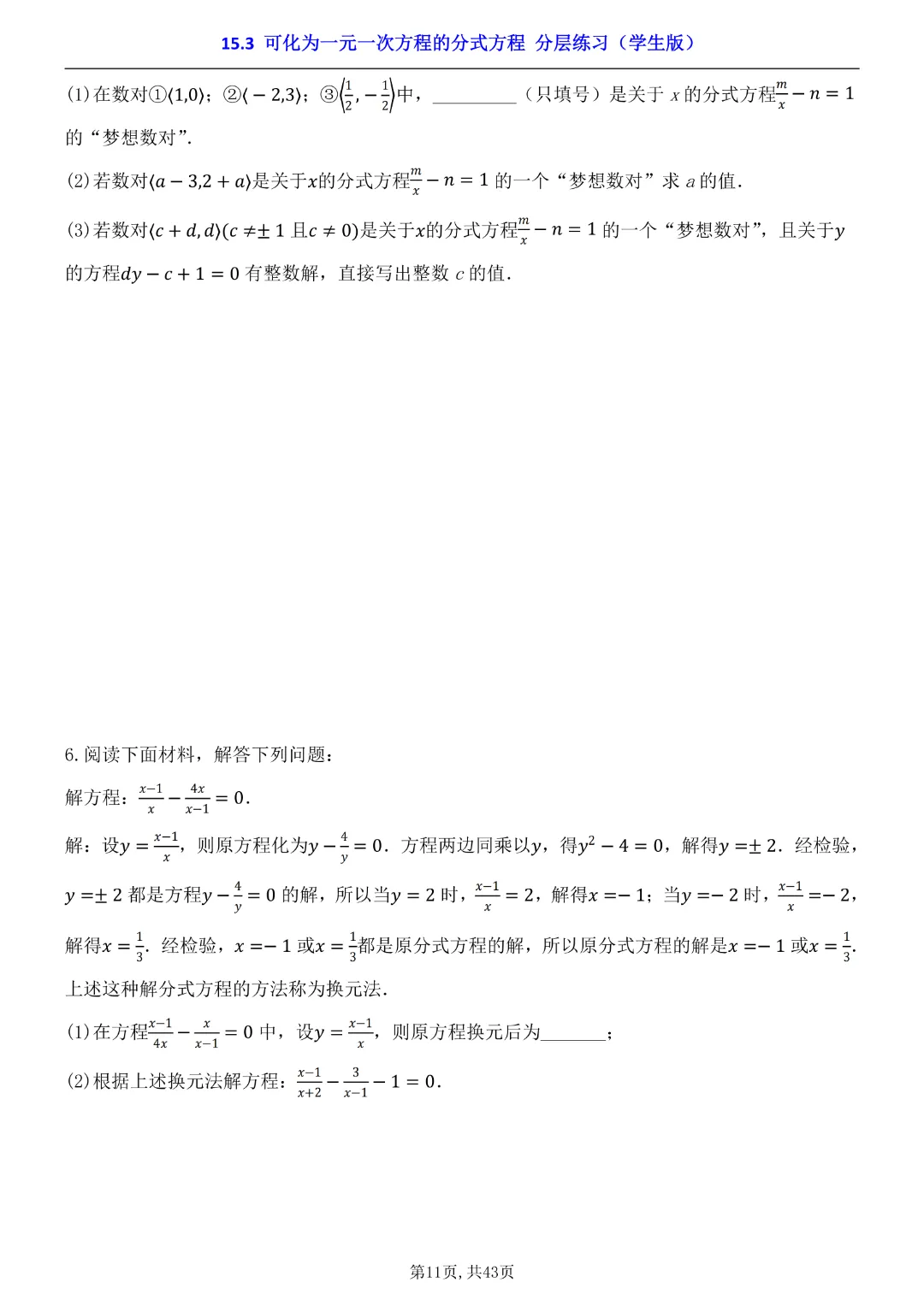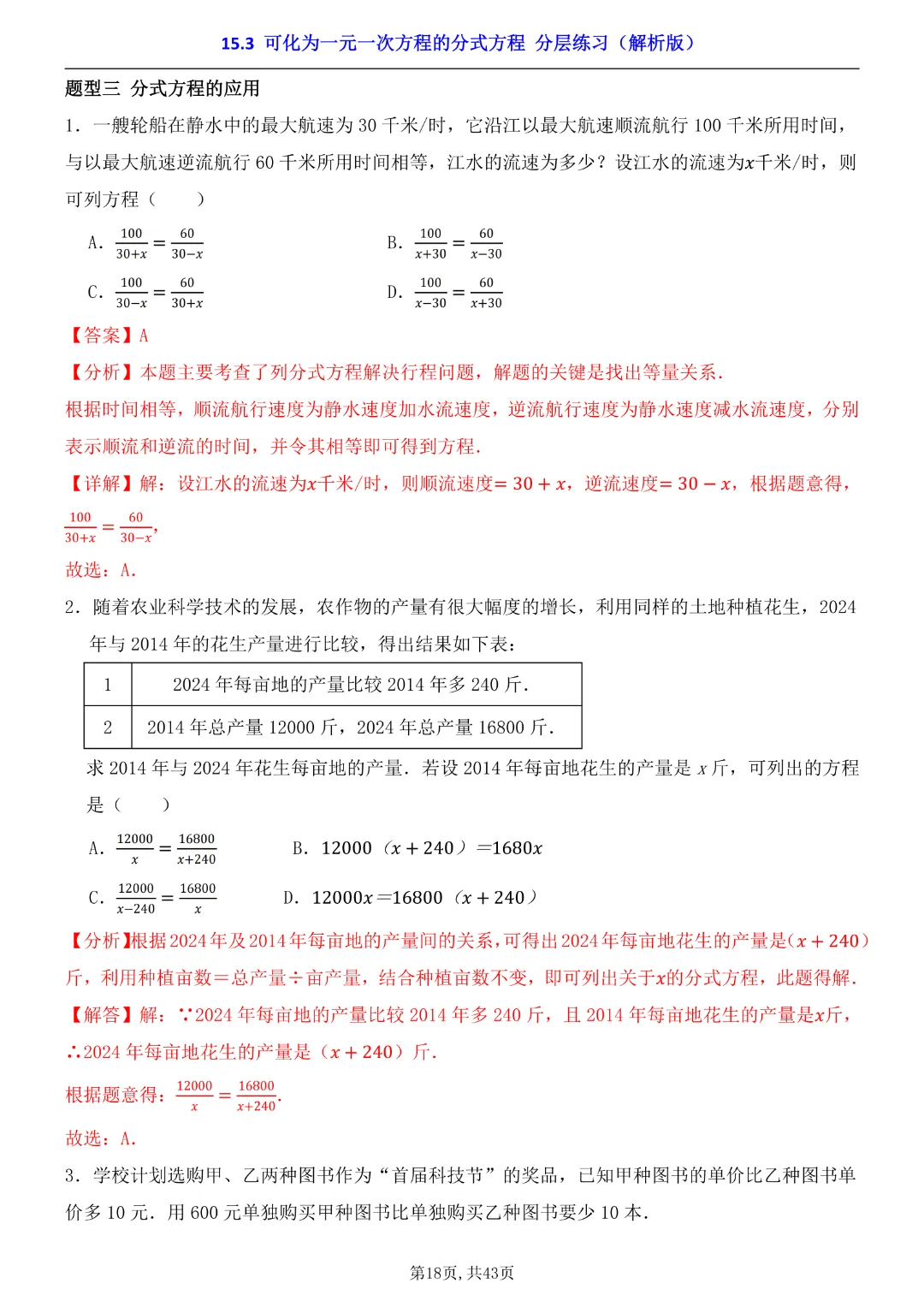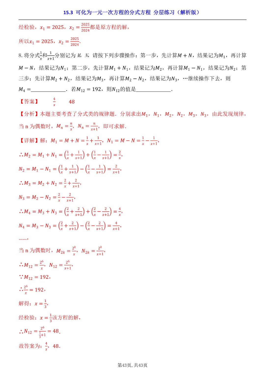 2026年八年级下册数学【15.3 可化为一元一次方程的分式方程 分层练习附解析】(华东师大版)高清电子版可打印