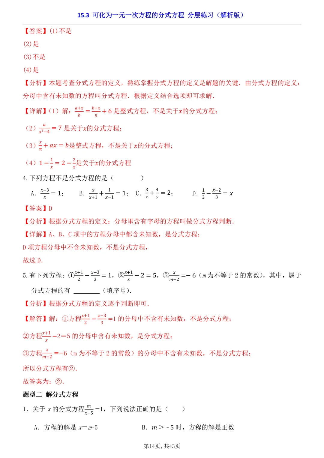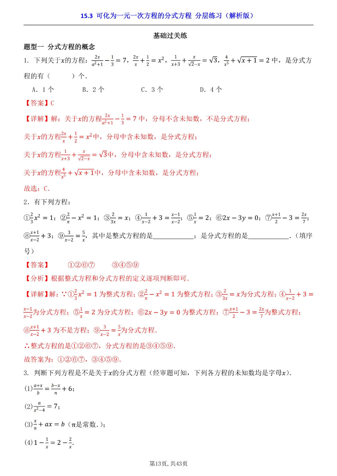 2026年八年级下册数学【15.3 可化为一元一次方程的分式方程 分层练习附解析】(华东师大版)高清电子版