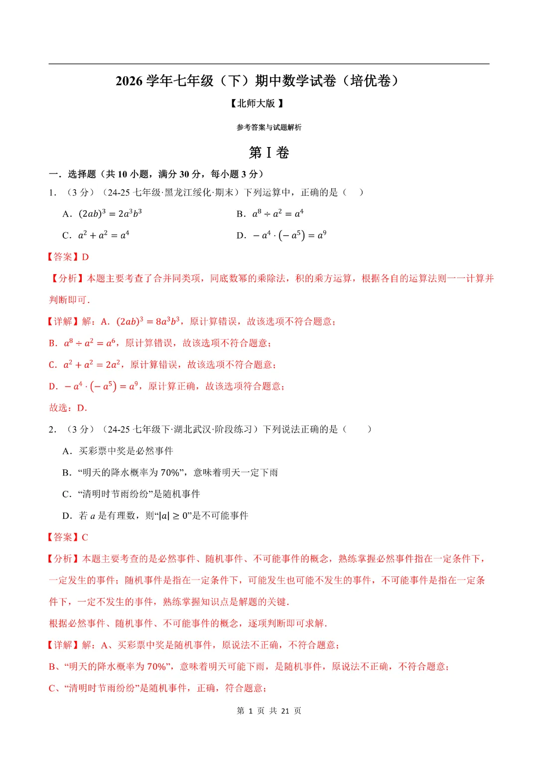 今天给大家分享的是:【2026春新版七年级下册数学】【北师大版】期中测试卷2套带答案|完整高清电子版可打印