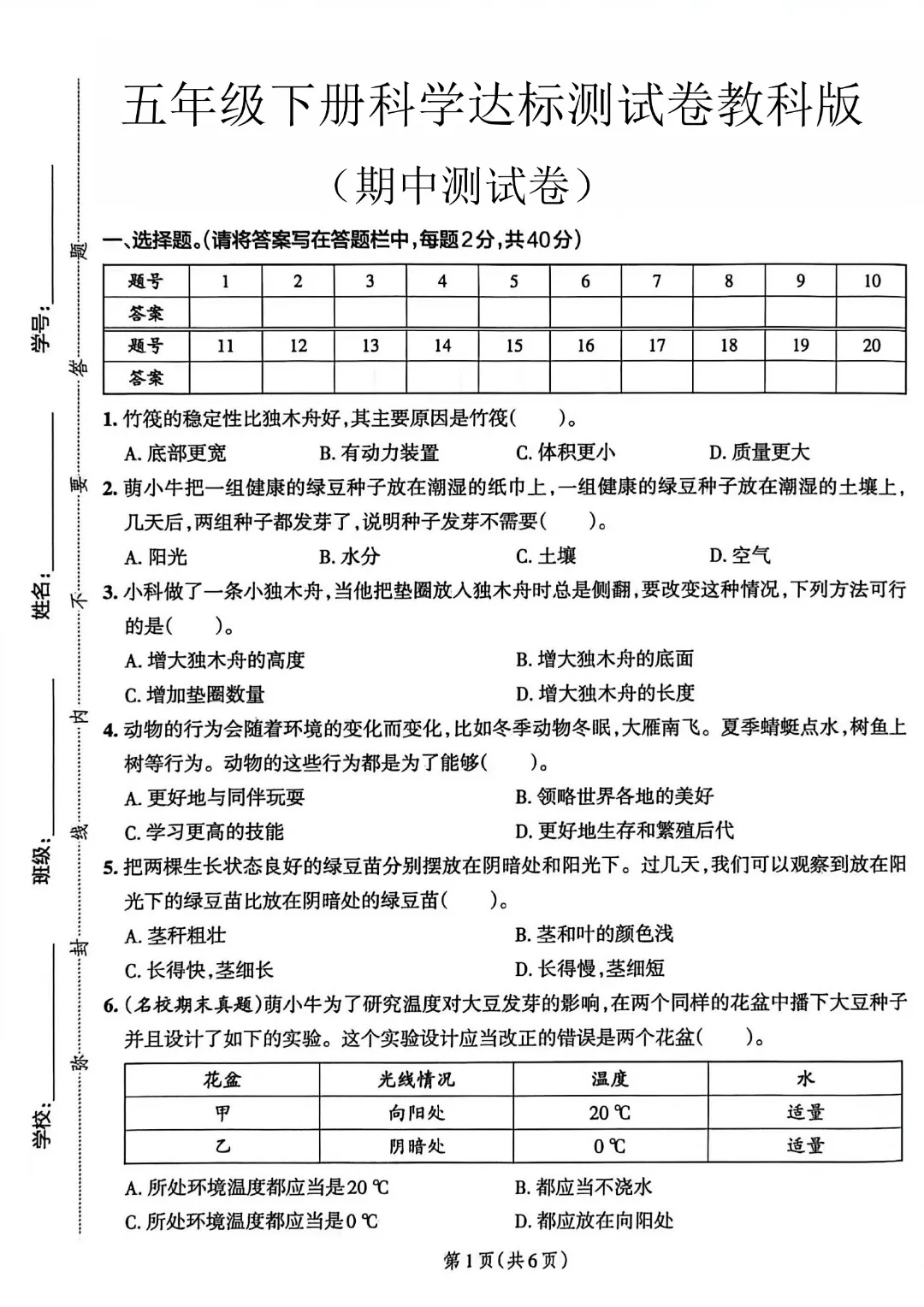 26春新版五年级下册科学【教科版】【第1-3单元测试卷+期中测试卷】带答案丨完整高清可打印