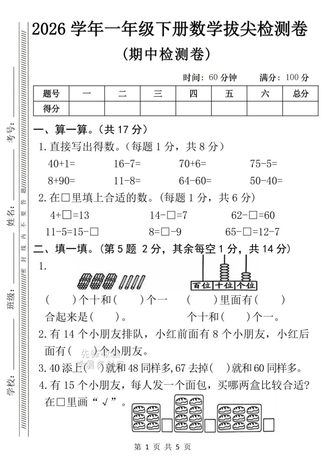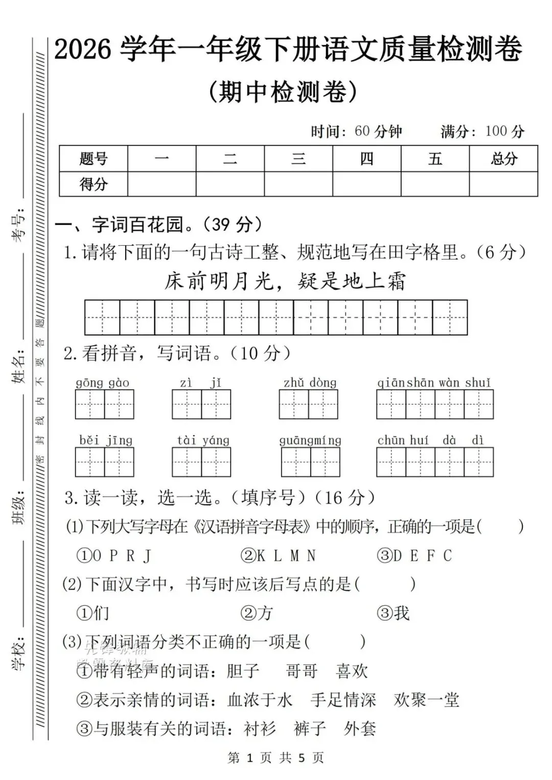26春新版一年级下册语文数学期中检测卷,电子版可打印