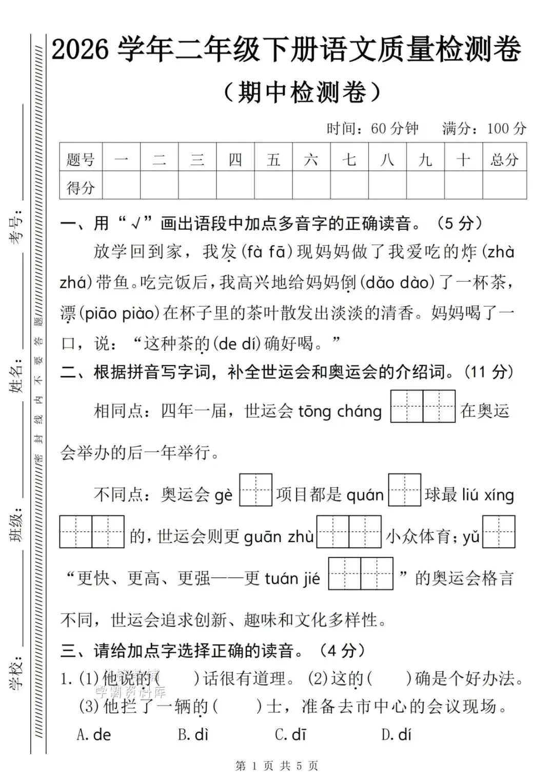 26春新版二年级下册语文数学期中检测卷,电子版可打印