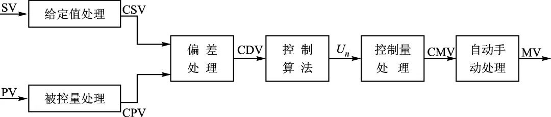 在手动(SM 或 HM)状态下,应使给定值(CSV)跟踪被控量(CPV),同时也要把历史数据,如 e(n-1)和 e(n-2)清零,还要使 u(n-1)跟踪手动控制量(MV 或 VM)。从输出保持状态或安全输出状态切向正常的自动工作状态时,可采取类似的措施。