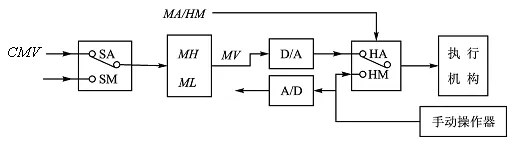 当开关处于 HA 位置时,控制量 MV 通过 D/A 输出,称为自动状态(HA)状态);