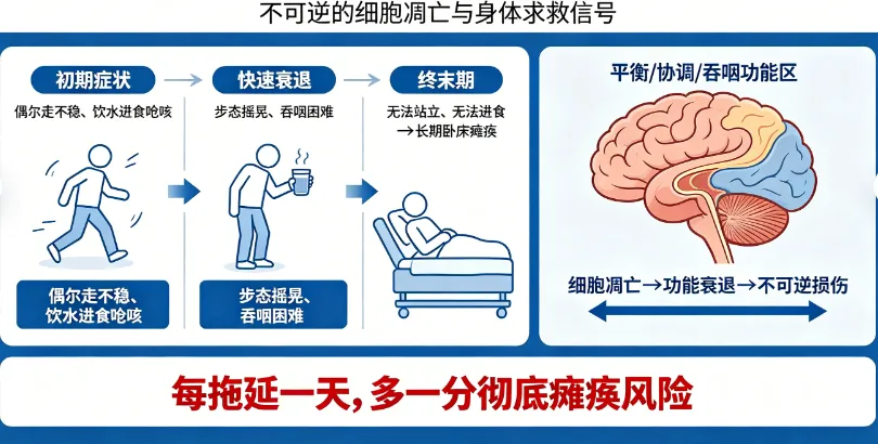 走路发飘→步态摇晃→无法站立→卧床不起;喝水呛咳→吞咽困难→无法进食→全身衰竭,这是小脑快速凋亡的固定发展路径,每一步都在加速,每拖延一天,就多一分彻底瘫痪的风险。