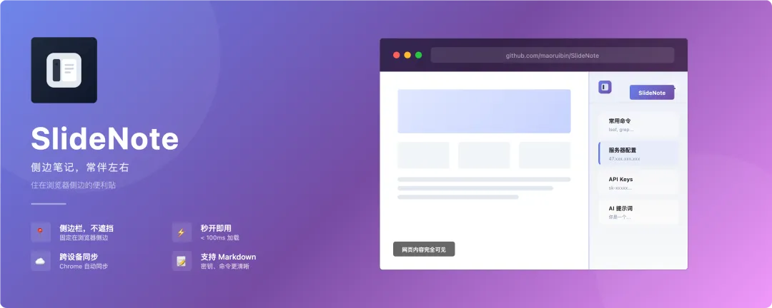 SlideNote 是个啥?简单来说,它就是个”住在浏览器侧边的便利贴”。和其他笔记插件不一样,它完全利用 Chrome 的侧边栏 API,固定在浏览器右侧,完全不遮挡你的网页内容。你看文档、写代码的时候,随手就能点开记点东西,用完随手关上,整个过程丝滑得不行。