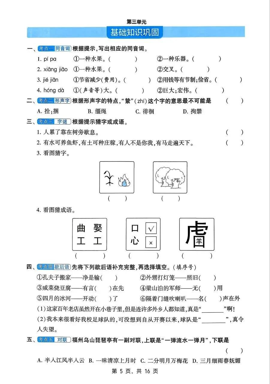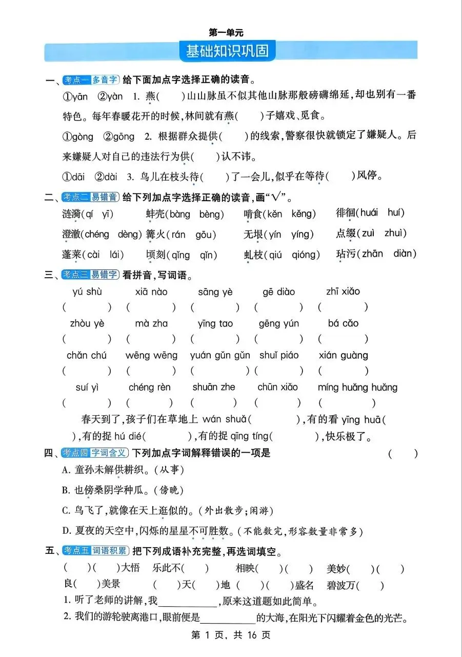 五年级语文下册单元基础知识巩固电子版免费领取