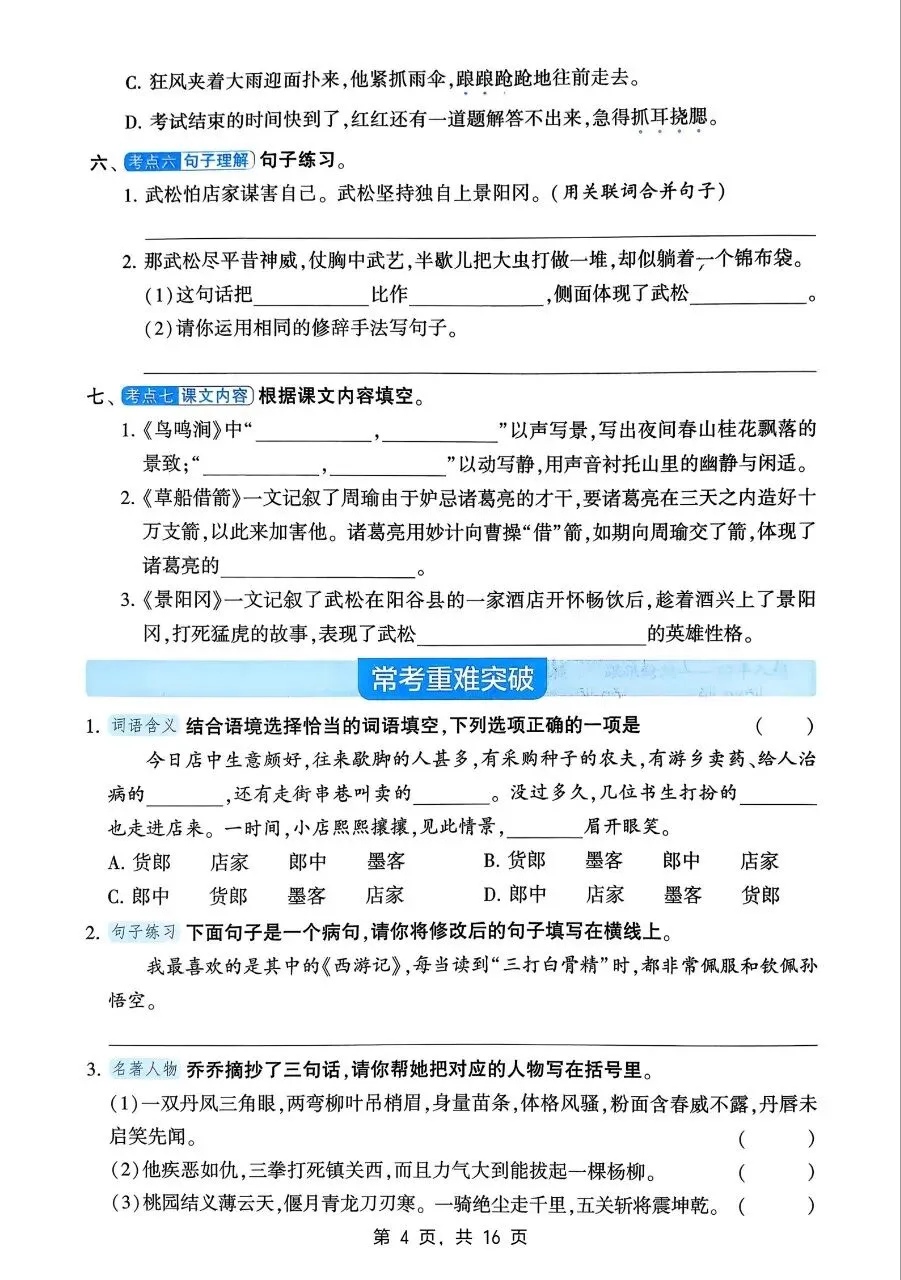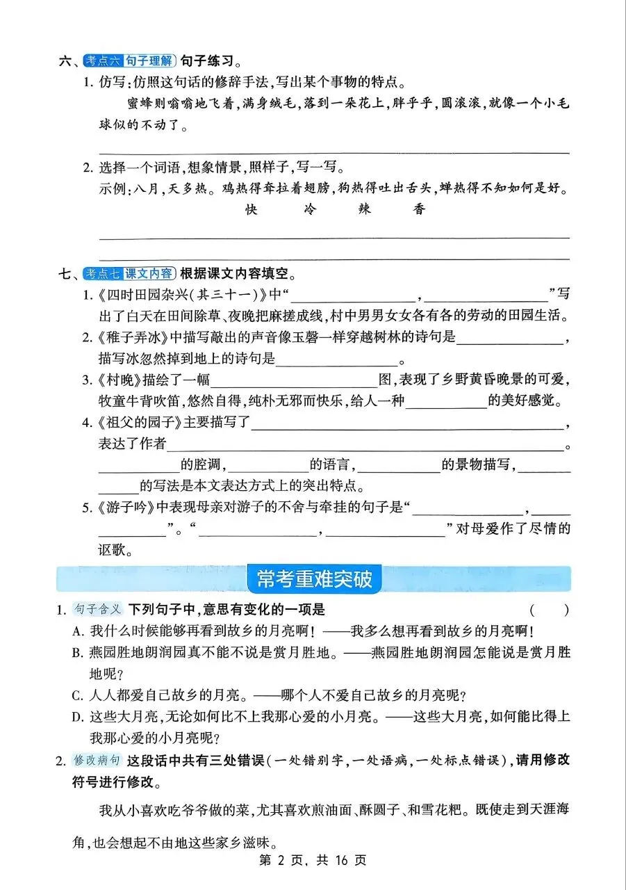 句子板块,重点掌握比喻、拟人、排比、夸张、反问、设问等修辞手法,能熟练进行句式转换、扩句、缩句、修改病句,正确运用标点符号,理解含义深刻的句子,体会句子表达效果,提升语言表达严谨性。