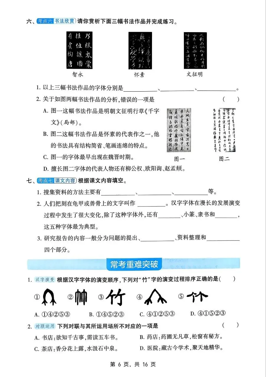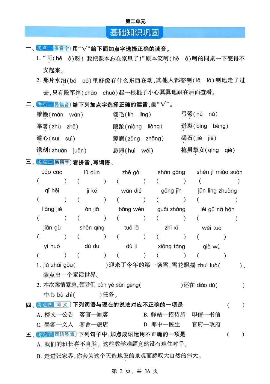 生字字词上,需精准掌握本册易读错、易写错、多音字、形近字,规范书写笔画与结构,杜绝错别字;熟练理解并运用四字词语、成语、歇后语、名言警句,区分近义词、反义词,掌握词语的感情色彩,学会词语辨析与灵活搭配,积累课文中的经典词句。