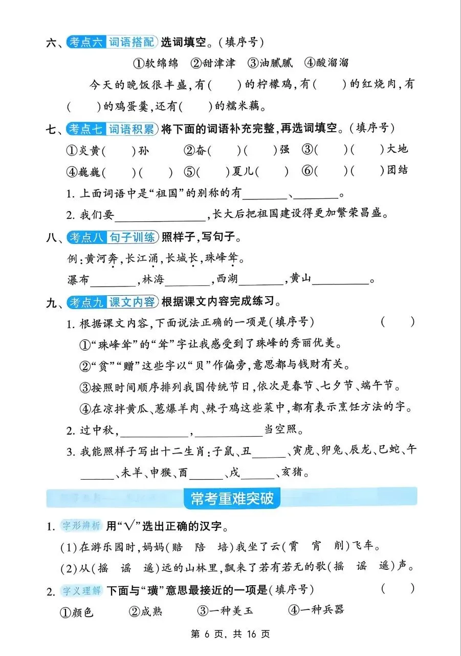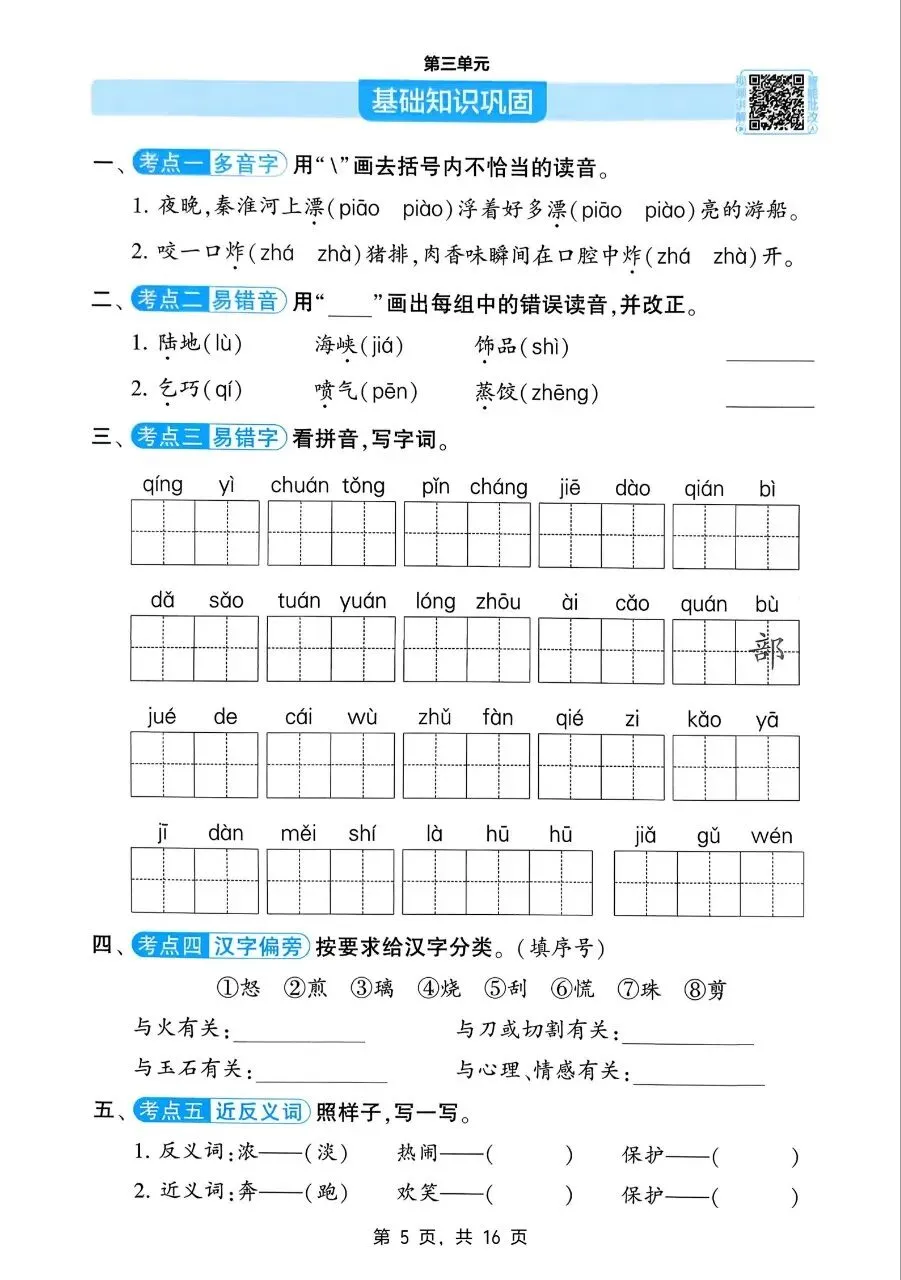 生字词是核心,需熟练掌握本册会写字的笔画、结构、部首,规范书写不写错字、别字;区分多音字、形近字、同音字,如“辨、辩、瓣”“蓬、篷”,掌握生字组词、造句。同时积累课本中的成语、谚语、四字词语,掌握近义词、反义词,学会词语搭配,夯实词汇基础。
