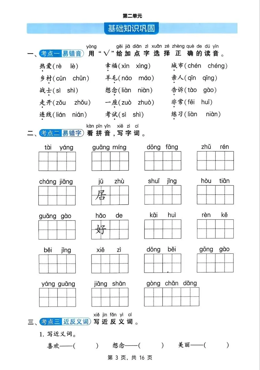 – 近义词:开心—快乐、好看—漂亮、喜欢—喜爱