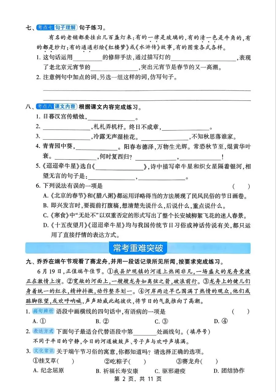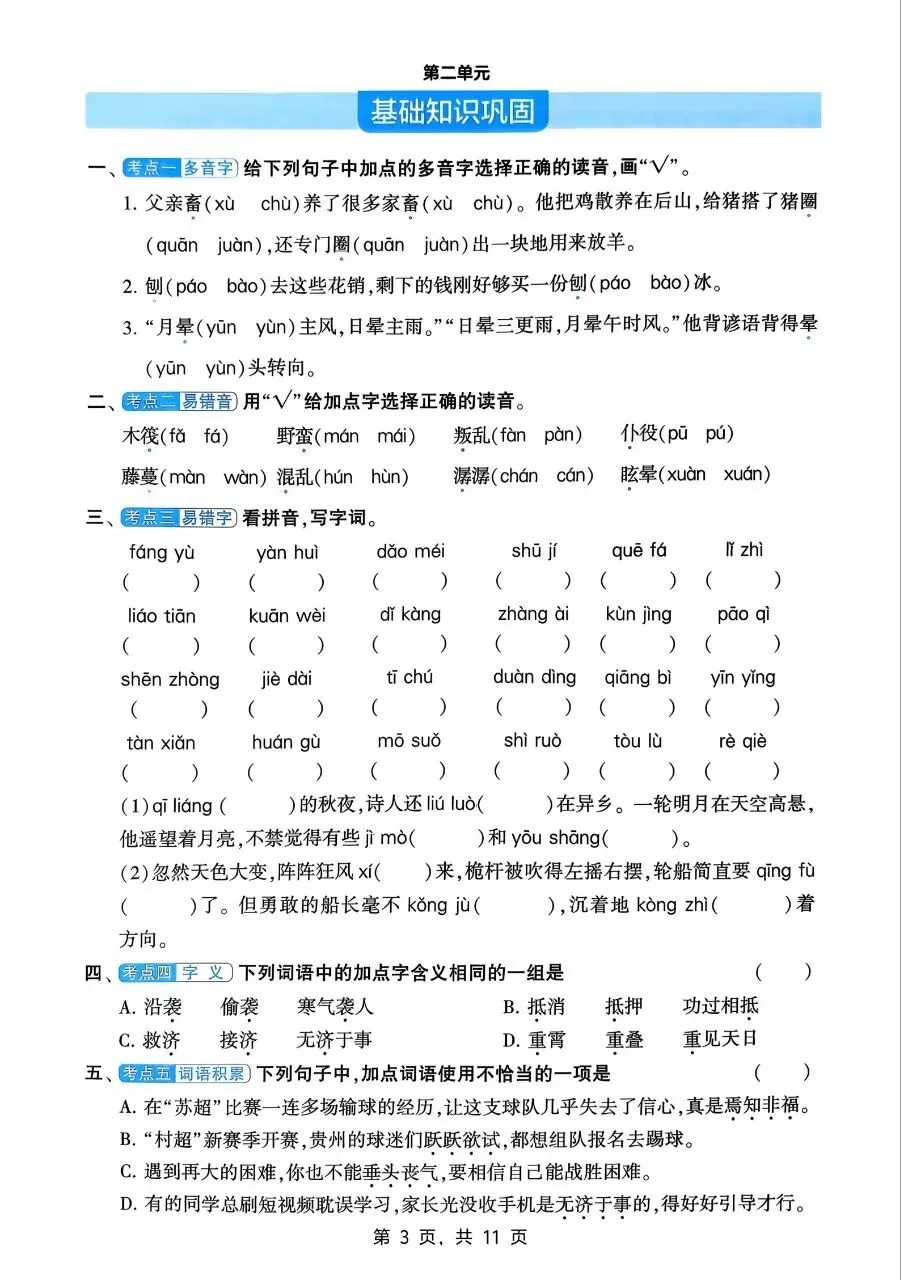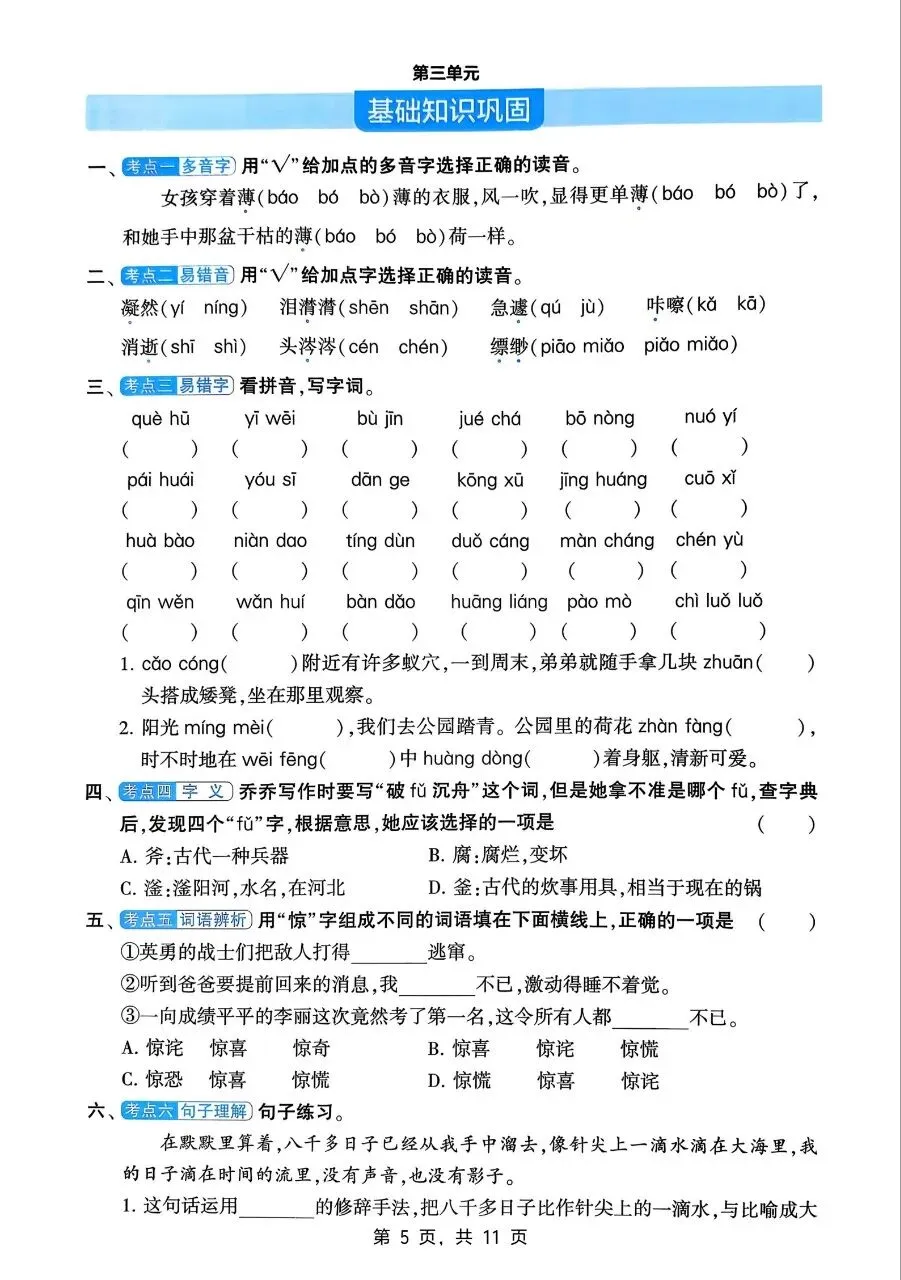 字词方面,需牢固掌握本册生字、多音字、形近字、易错字,规范书写,理解词义;熟练运用成语、俗语、名言警句,区分近义词、反义词及词语感情色彩,掌握词语搭配、词义辨析方法,夯实词汇功底。