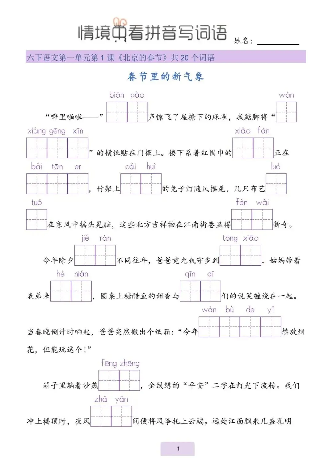 一年级(下)语文《看拼音写词语》