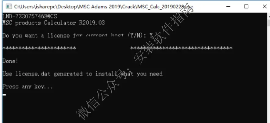 2.打开MSC_Calc_20190228.exe进入许可证制作界面,输入Y点击回车就可以自动在文件夹生成一个许可文件License.dat