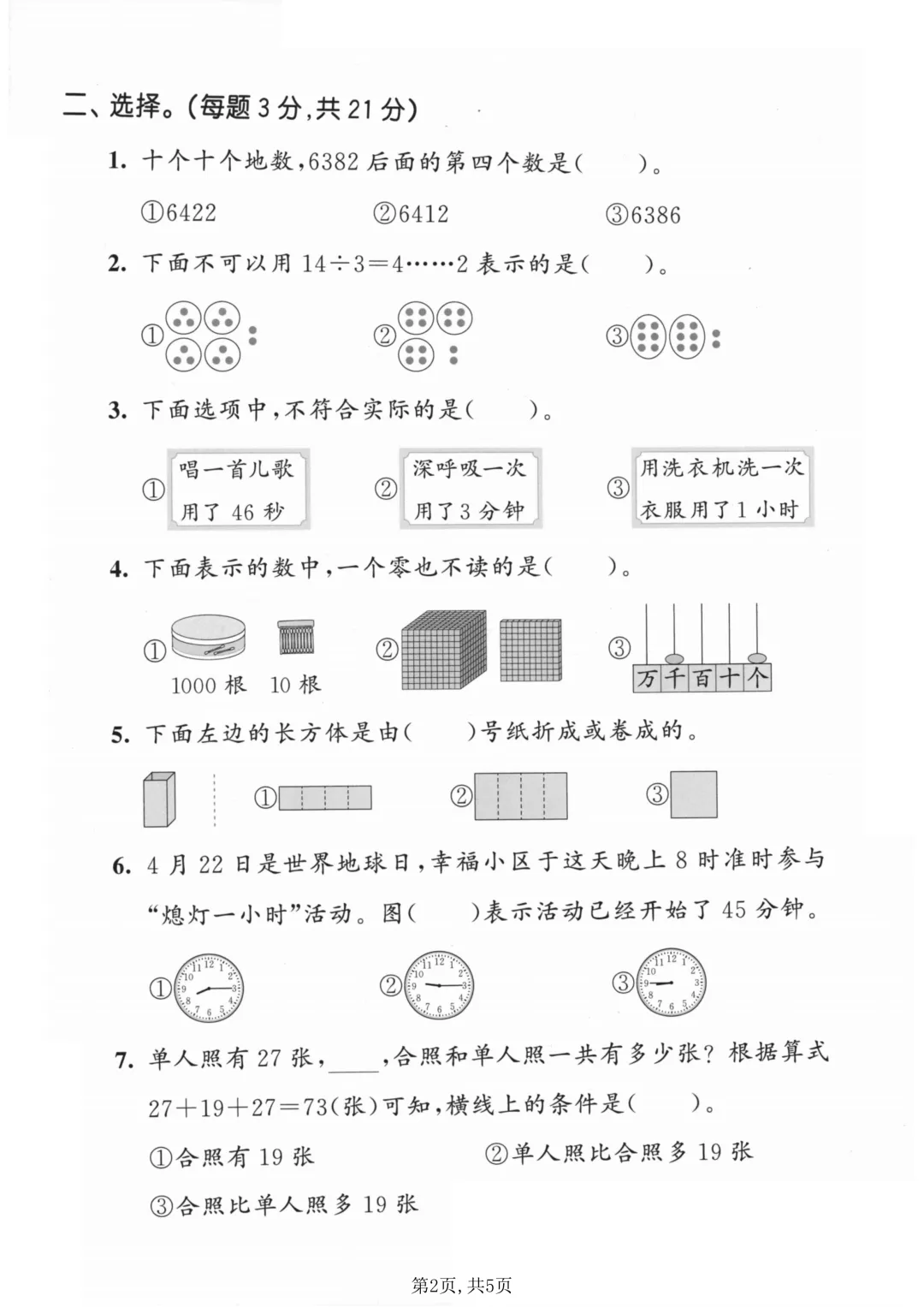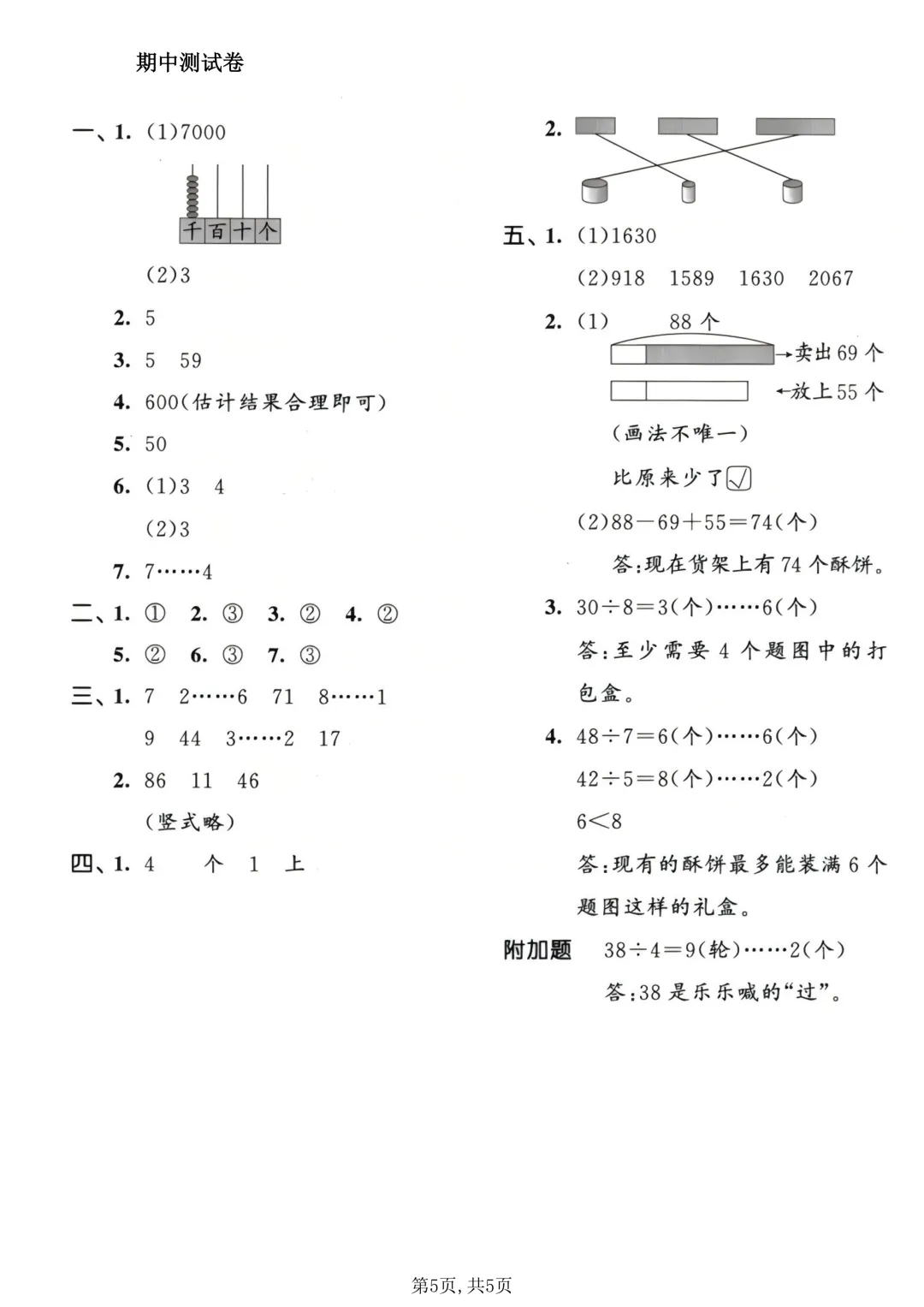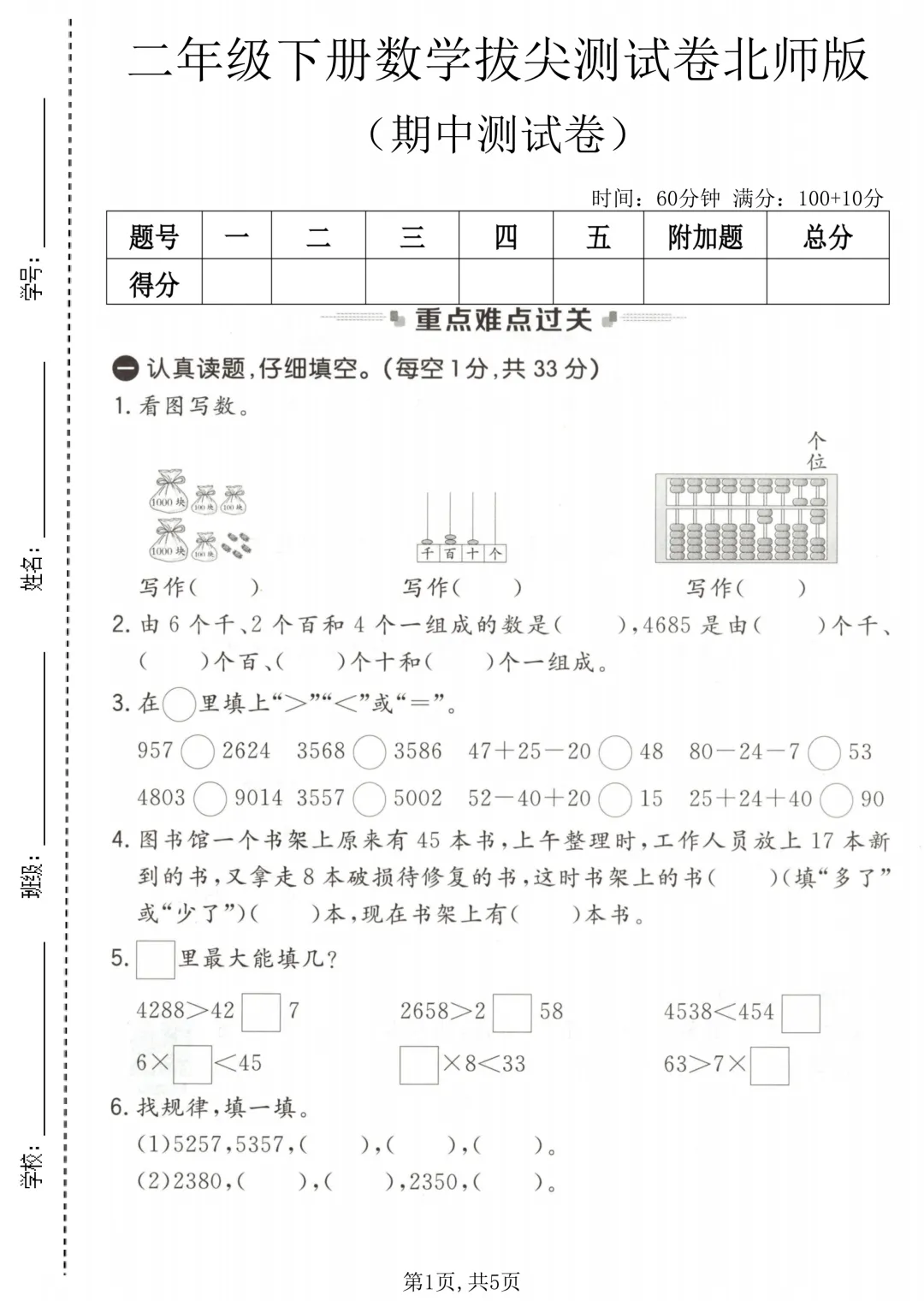 26年春二年级(下)数学期中拔尖测试卷《北师版》。精准覆盖教材核心考点试卷严格贴合北师大版二年级下册教材,覆盖表内除法、万以内数的认识与加减运算、有余数的除法、时分秒的认识与计算、图形的运动(平移、旋转)、人民币的简单换算与应用等核心知识点,题型设计与教材例题高度匹配,难度循序渐进,帮助孩子扎实掌握课本内容。分层训练,满足不同需求试卷通常分为基础夯实卷、综合质量卷和拔高提升卷:基础卷聚焦核心知识点,帮助孩子筑牢数学根基,避免基础题失分;综合卷还原校内考试场景,全面考查知识掌握程度,帮助查漏补缺;拔高卷适度增加难度,锻炼孩子的审题能力和灵活解题思维,适合学有余力的孩子冲刺高分。培养良好的答题习惯试卷排版采用大字护眼设计,预留充足书写空间,帮助孩子养成整洁书写的习惯。同时,详细的参考答案和解题步骤,让孩子能够自主核对和纠错,培养独立学习能力。需要的家长抓紧打印出来,让孩子写一写,练一练吧。