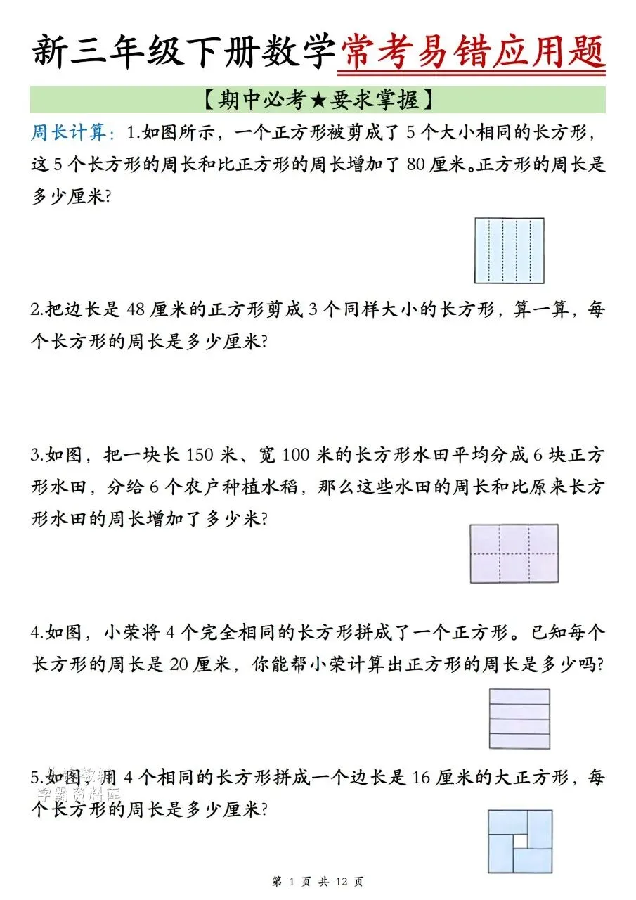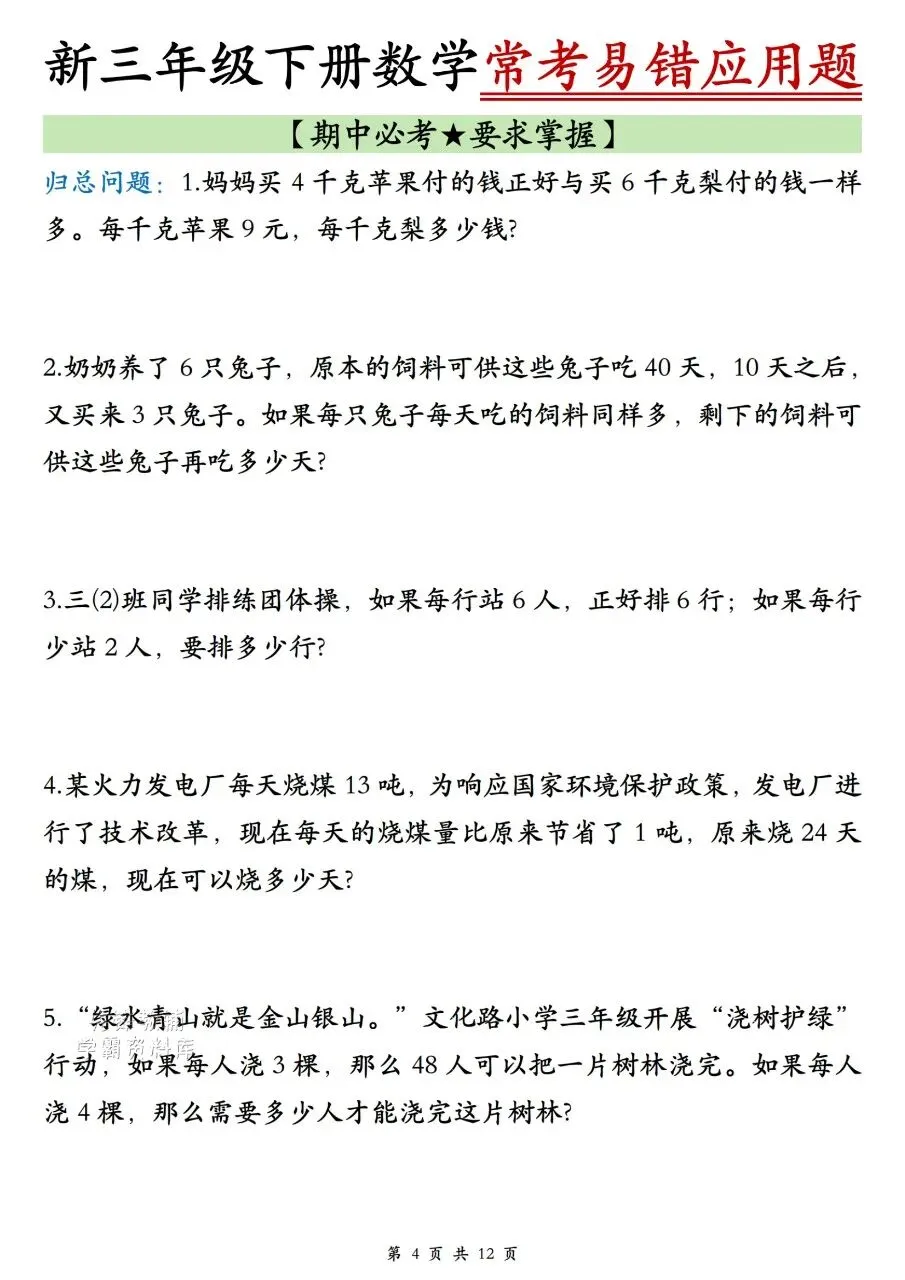 三年级下册数学|期中常考易错应用题(可下载打印)