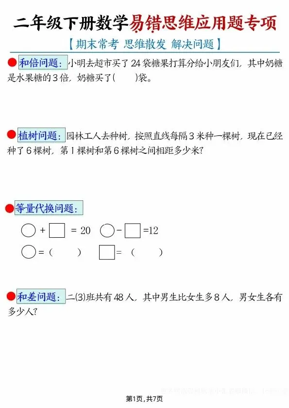 今日分享二年级下册数学易错思维应用题专项(完整电子版可打印)!高清电子版可直接打印,排版规整适配练习,不用费心整理,孩子每日一练夯实基础,家长辅导省心!