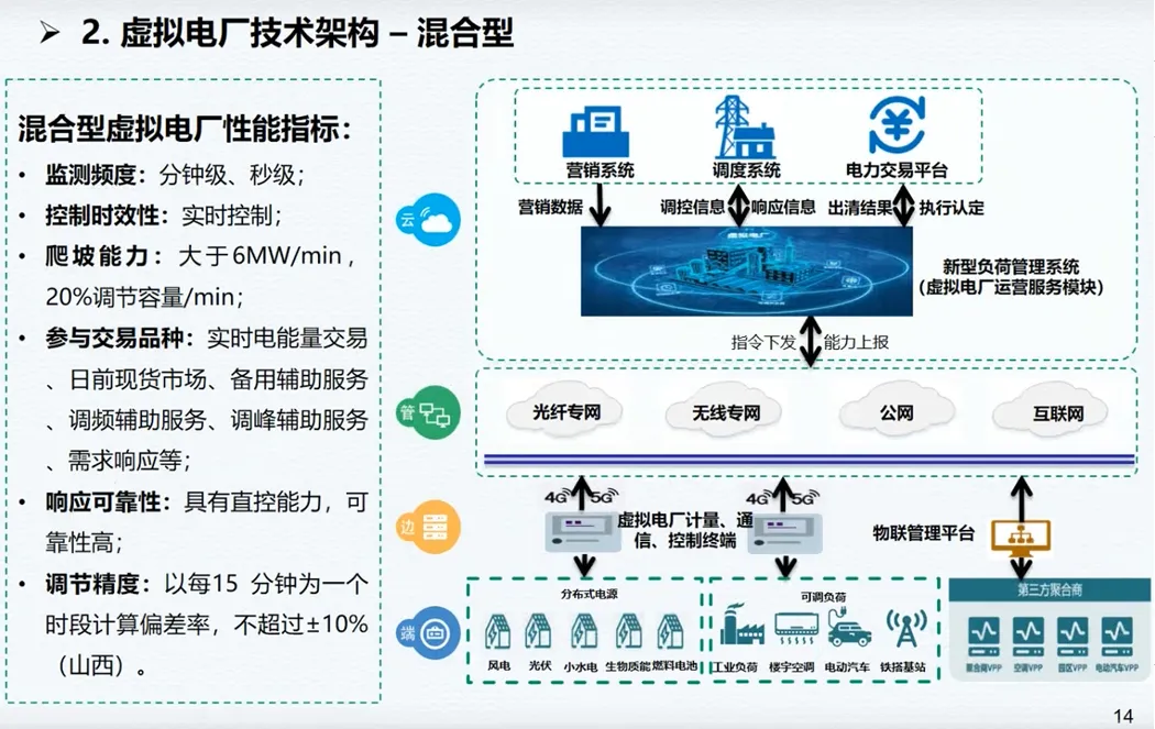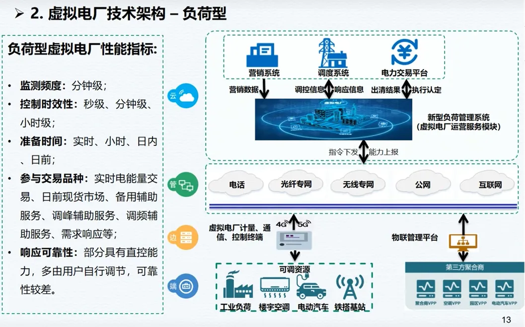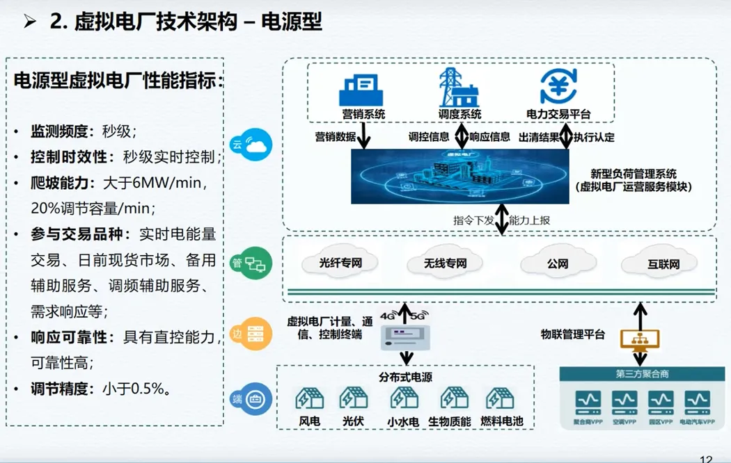 这份报告从技术、市场、商业三维度,拆解虚拟电厂落地全逻辑。按聚合资源,虚拟电厂分为电源型、负荷型、混合型三类,核心技术覆盖发用电预测、可调节潜力评估、调峰调频控制、市场化交易、效果核证、运行仿真六大体系,其中电源型与混合型可实现秒级监测、实时控制,调节精度达 0.5% 以内。