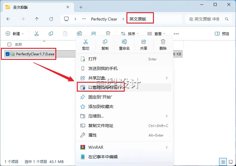 2.右键【PerfectlyClear1.7.0.exe】选择【以管理员身份运行】