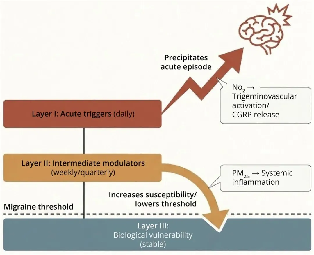 以色列的科研团队意识到,环境对大脑的影响绝非单一维度的袭击。他们提出了一个极具颠覆性的“分层模型”。在这个模型里,偏头痛的爆发不是一个瞬间的决定,而是三个层次的合力作用。
