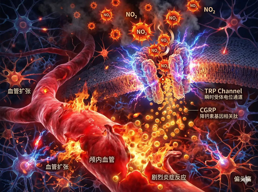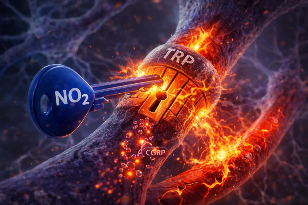 二氧化氮会像一把粗鲁的钥匙,强行扭动瞬时受体电位通道这把锁,导致一种名为降钙素基因相关肽(CGRP)的化学物质大量释放。