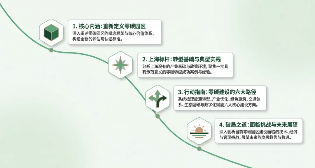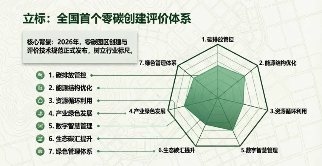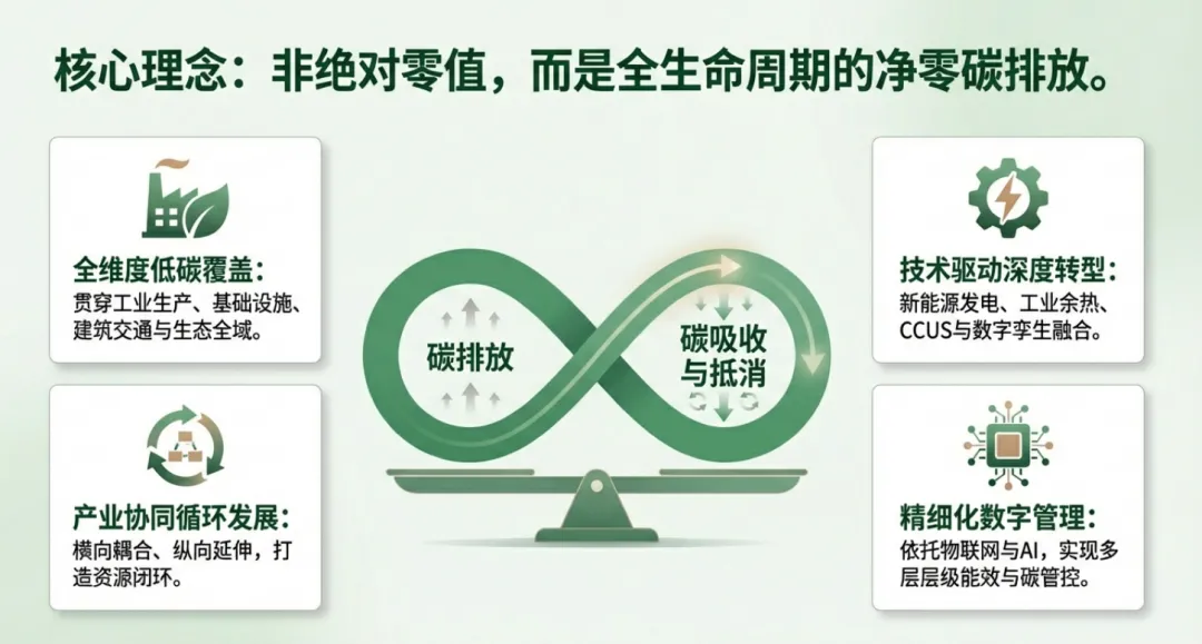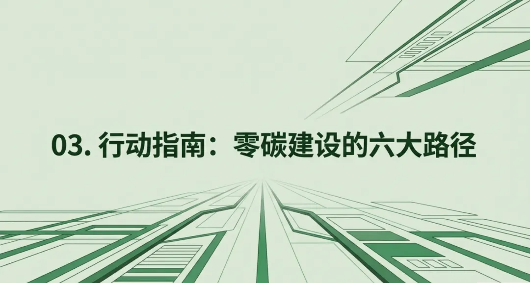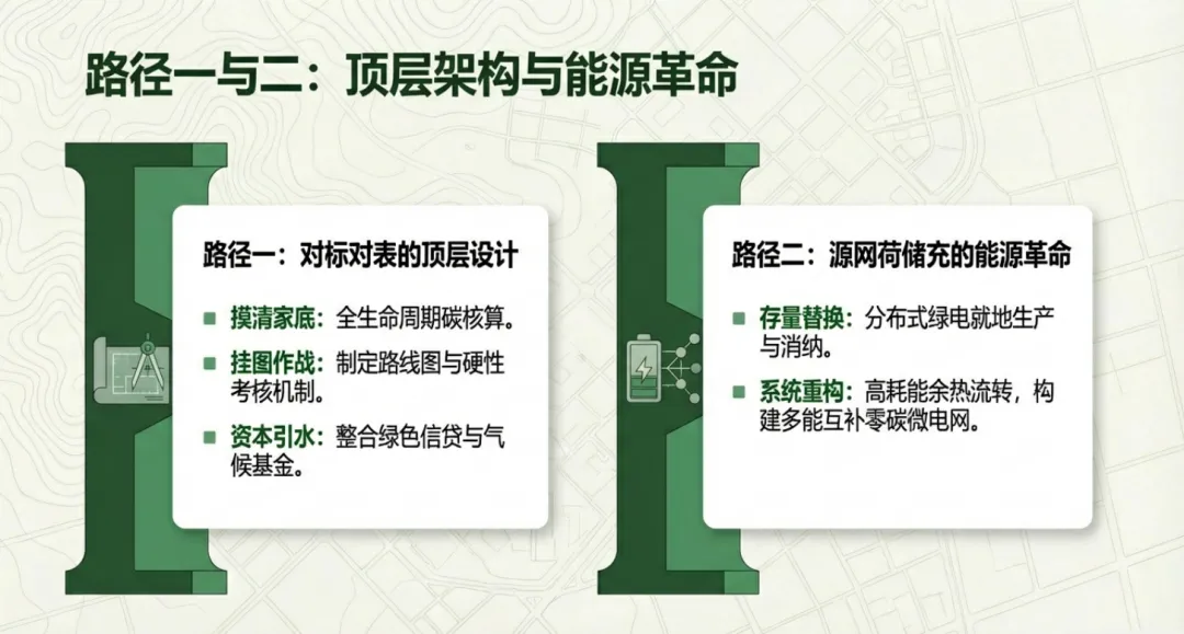 零碳园区建设有六大核心路径:先做全生命周期碳核算与顶层路线设计,再推进源网荷储充能源革命;一边严控高耗能准入、打造产业链循环,一边培育碳服务与低碳材料产业;用数字孪生与物联网实现全域智能管控,同步推进生态碳汇与碳交易闭环。