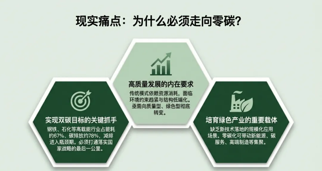 零碳园区不是绝对零排放,而是全生命周期净零碳排放,是产业绿色转型的最终形态。高载能行业贡献全国约 67% 能耗、78% 碳排放,零碳园区是双碳目标落地的核心抓手。