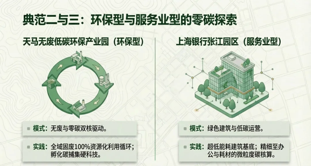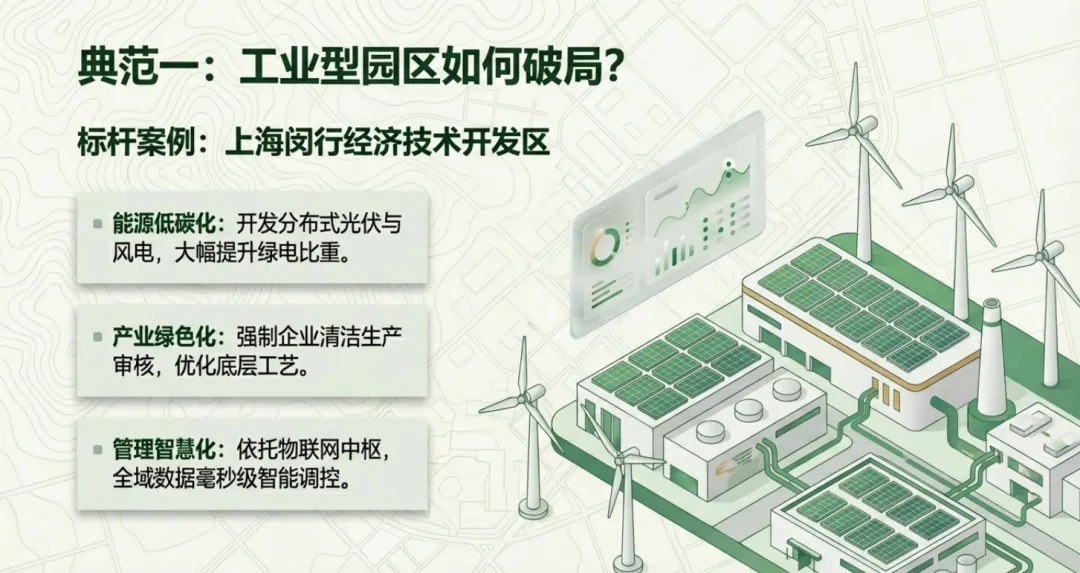 上海已形成高载能、传统制造、现代工商业三类园区定制化转型路径,2026 年发布全国首个零碳园区创建评价技术规范,构建碳排放管控、能源结构优化等七大评价维度。闵行经开区、天马无废低碳产业园、上海银行张江园区形成工业、环保、服务业三类标杆范式,覆盖绿电替代、工艺升级、无废循环、超低能耗建筑等落地场景。