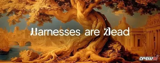 CrewAI 发布配图:一棵盘根错节的古树映衬古罗马城市,”Harnesses are Dead” 横贯其上