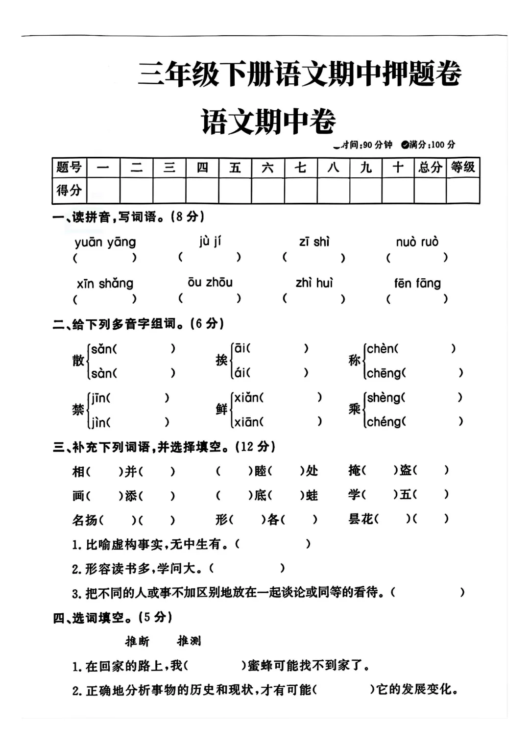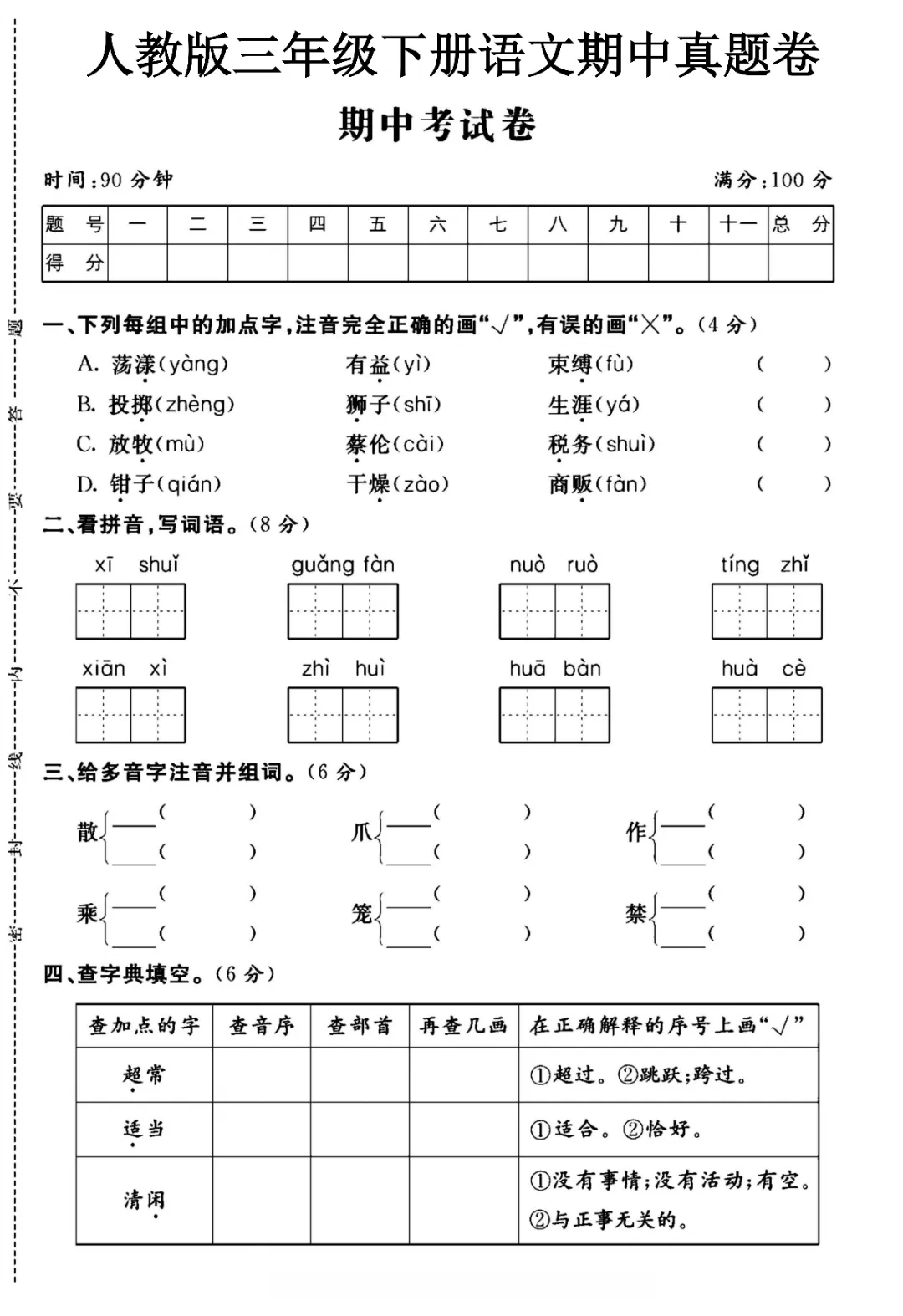 2026春人教统编版三年级下册语文《期中素养评估卷 3套》,含详细答案共17页(篇幅原因,仅仅展示部分内容),电子版可打印可下载。围绕三年级下册考试核心,展开练习,帮助孩子深入理解题型,夯实学科基础,培养孩子逻辑思维,提升知识综合运用能力与应试技巧,助力升学能力培养,从从容容游刃有余的度过春季学期。欢迎转发分享到班级群, 需要的家长们和老师们抓紧领取一份吧。