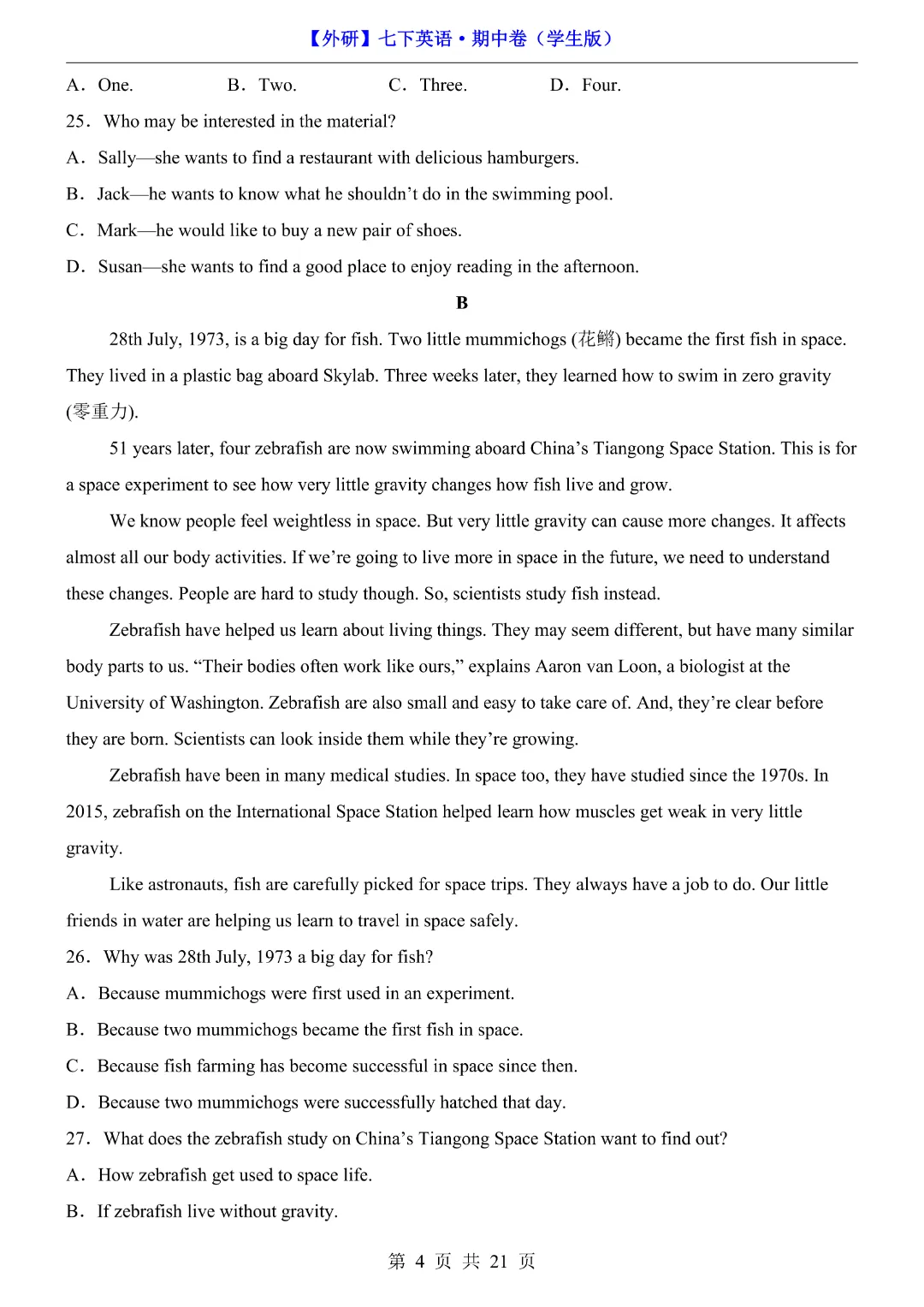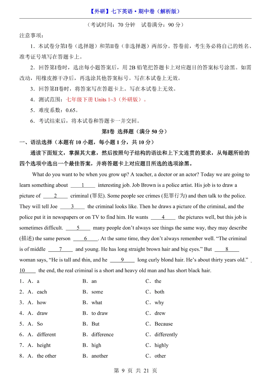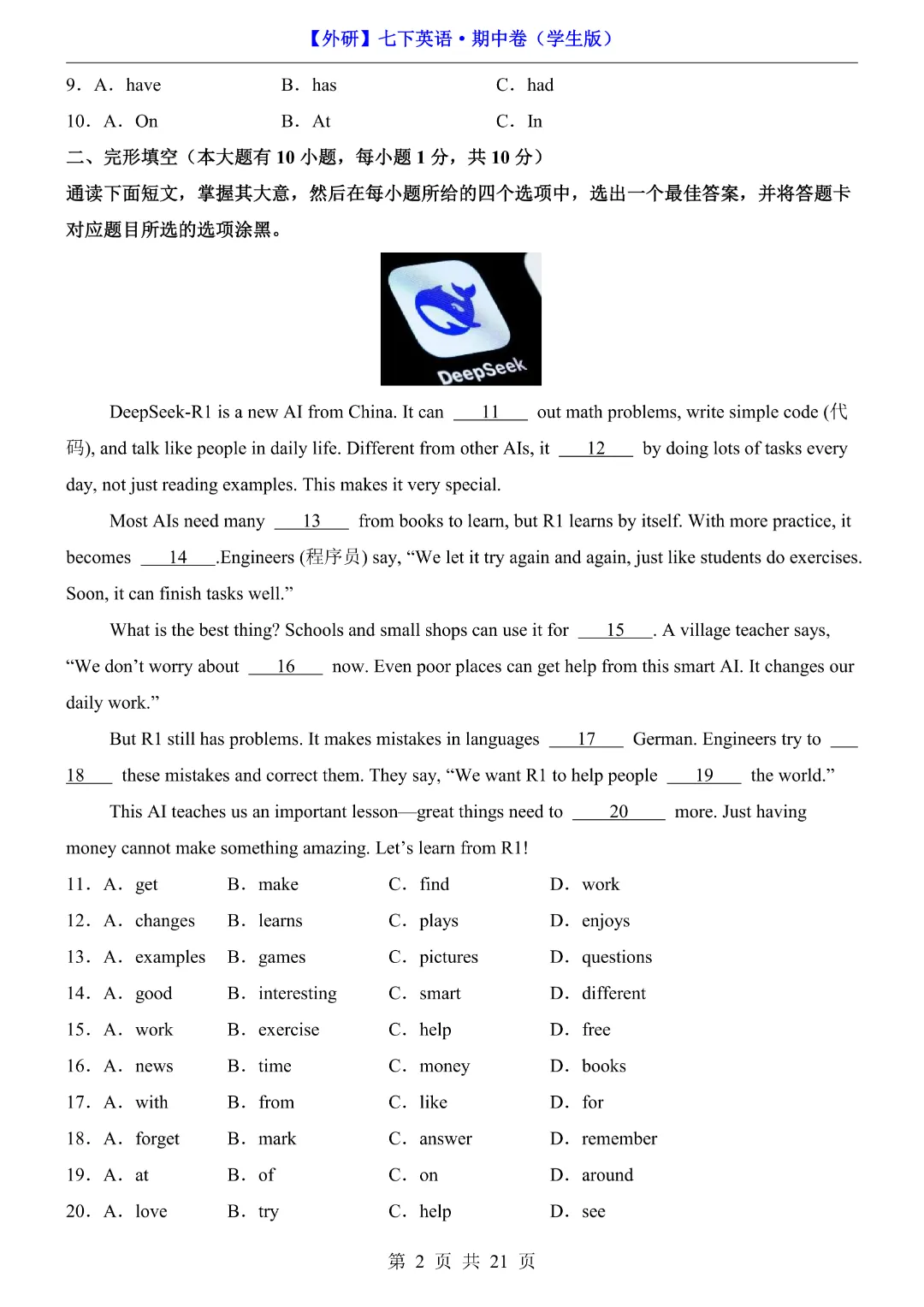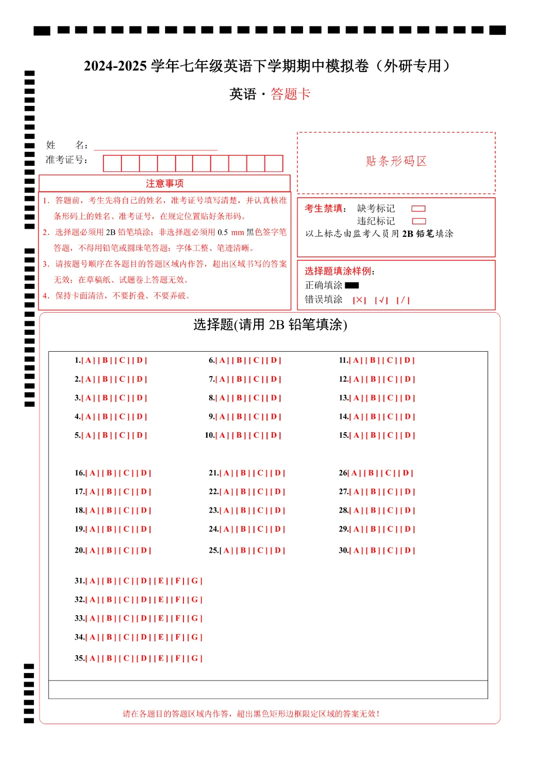 初一七年级下册英语外研版《期中考试测试卷2套含答案含答题卡》,完整可打印