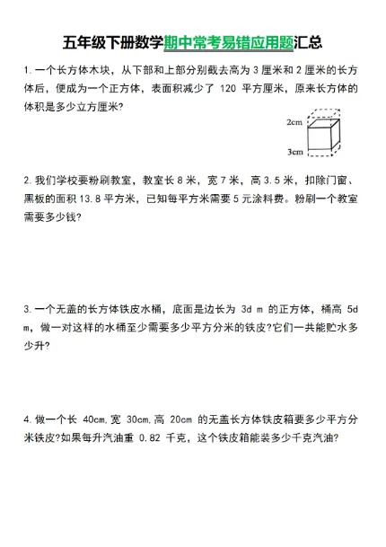 五年级(下)数学 常考易错应用题汇总,PDF电子版,可打印,免费下载