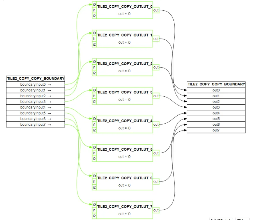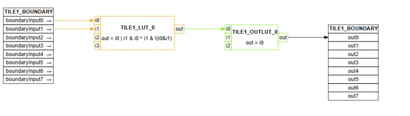 使用in0 和 in1 输入,利用4输入的LUT0,进行逻辑运算,通过OUTLUT0 -> CLBOUT12 -> outputxbar -> gpio