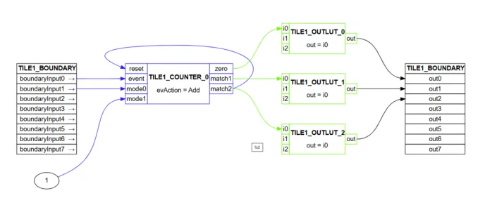 使用in0 和 in1 输入,利用4输入的COUNTER0,实现计数器功能,reset 来自cnt=match2, event事件来自in0,事件为add,当事件触发时,进行cnt+event_load_val的动作;