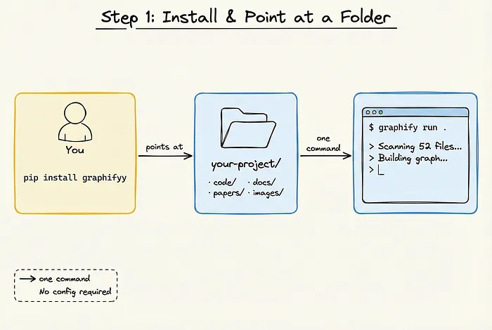 在项目目录下跑这条命令就行。Graphify 立刻开始扫描文件——不管是代码、PDF、图片还是视频,统统开始构建图谱。