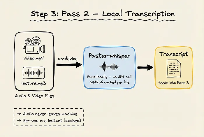 而且转写结果有 SHA256 缓存——只要媒体文件没变,重复运行时这一步瞬间完成。