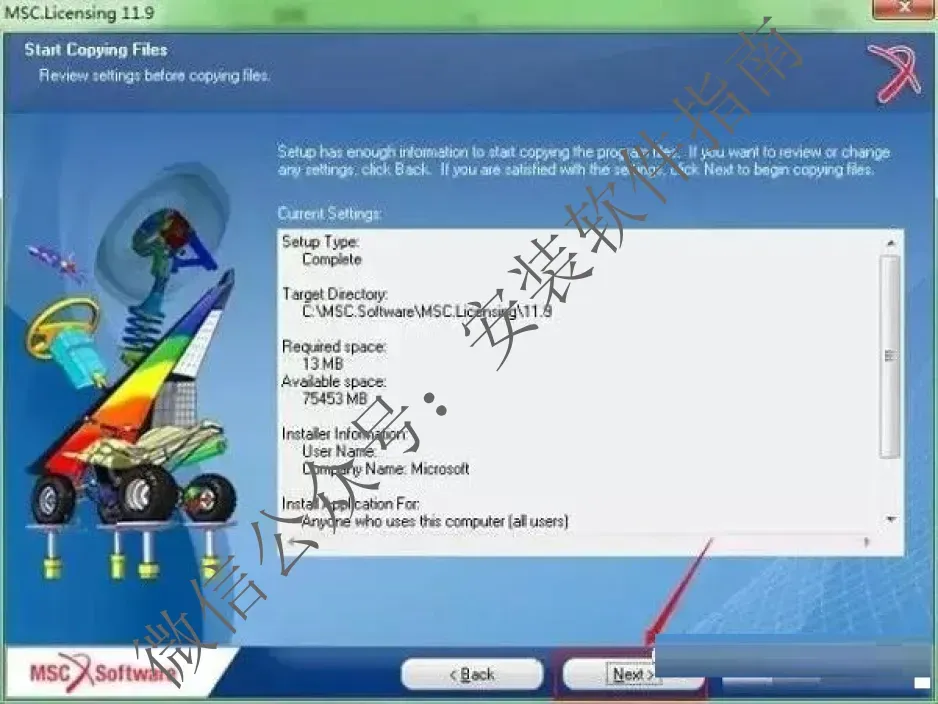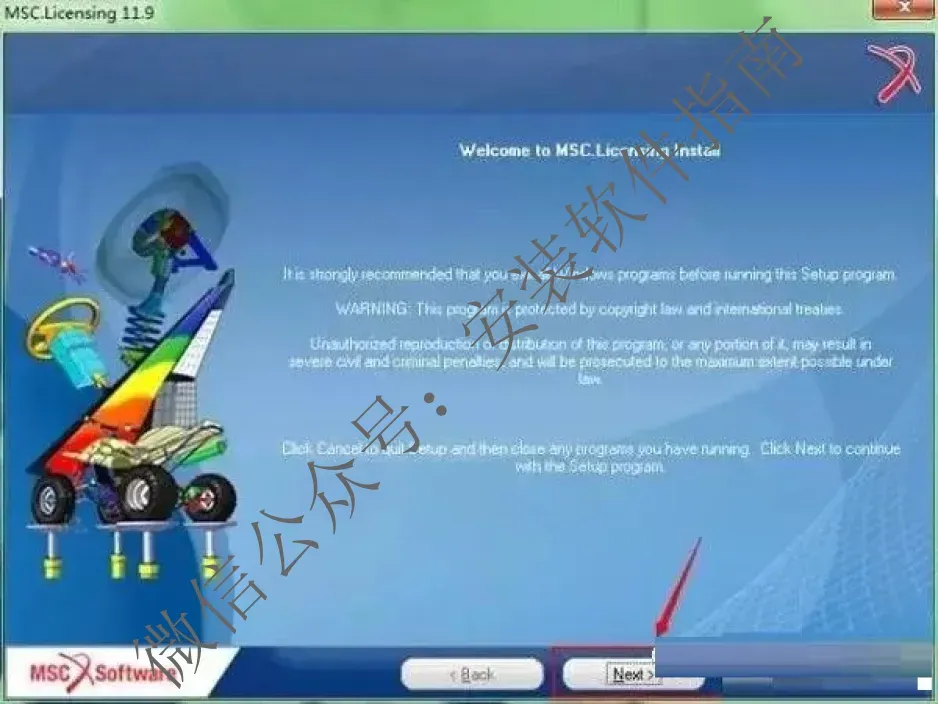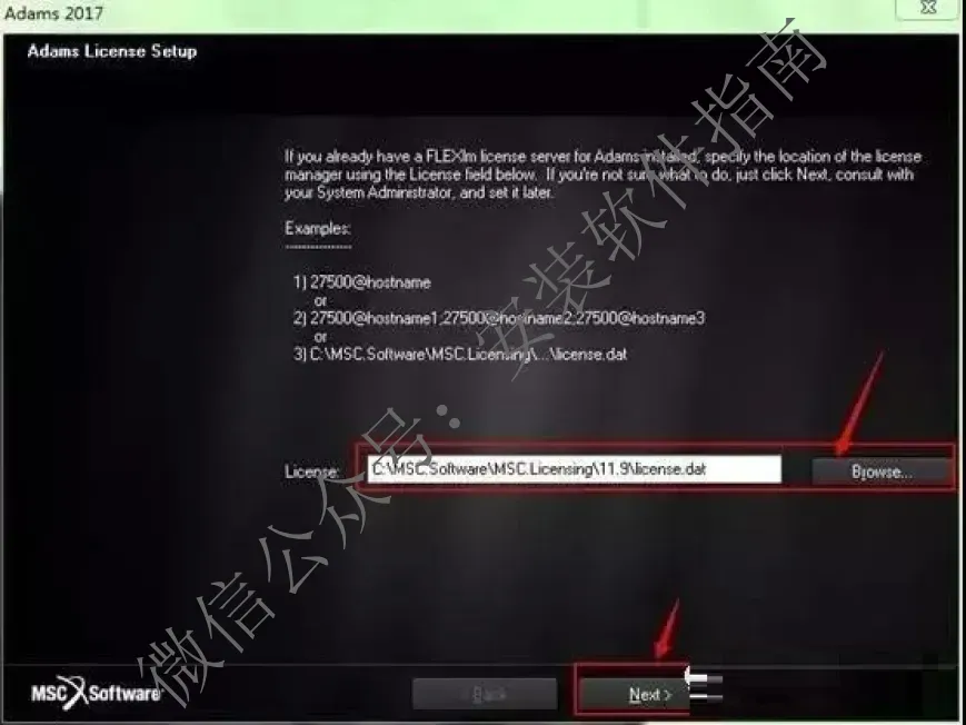 24.安装完成后会弹出以下界面,点“Browse”选择前面生成的许可文件license.dat(许可安装中新生成的),路径C:MSC.SoftwareMSC.Licensing11.9license.dat,然后点Next。