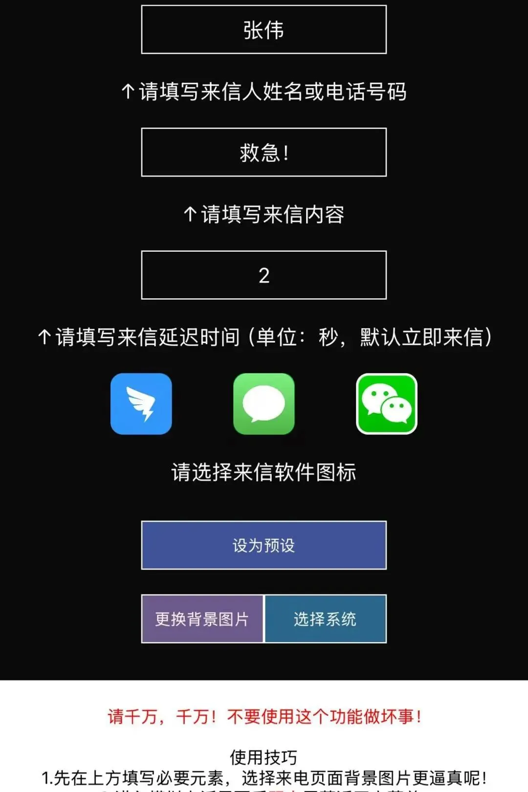 模拟消息功能设置短信、微信等常用场景,自定义发信人、内容与时间,触发后弹出真实通知样式,看起来和真消息一模一样。