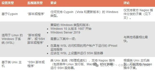 一般来说,Nagios插件是任何符合 Nagios插件指南(输出结构和退出代码)的可执行程序或脚本。由于没有适用于 Windows 的本机Nagios 插件,因此可以使用多种方案,具体取决于监控环境。