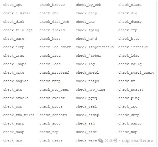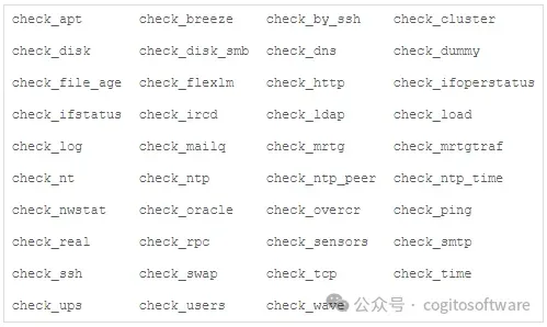 在我们的示例中,插件二进制文件将放入/usr/lib/nagios/plugins 中,并且可以使用以下插件: