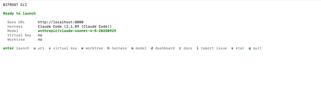 当 [Bifrost CLI](https://docs.getbifrost.ai/quickstart/cli/getting-started) 打开后,我可以直接在终端界面里配置会话。正如启动页所示,我可以查看/修改 Base URL、Harness、Model、Virtual Key(从 Bifrost 获取) 与 Worktree,而无需编辑配置文件或手动导出环境变量。
