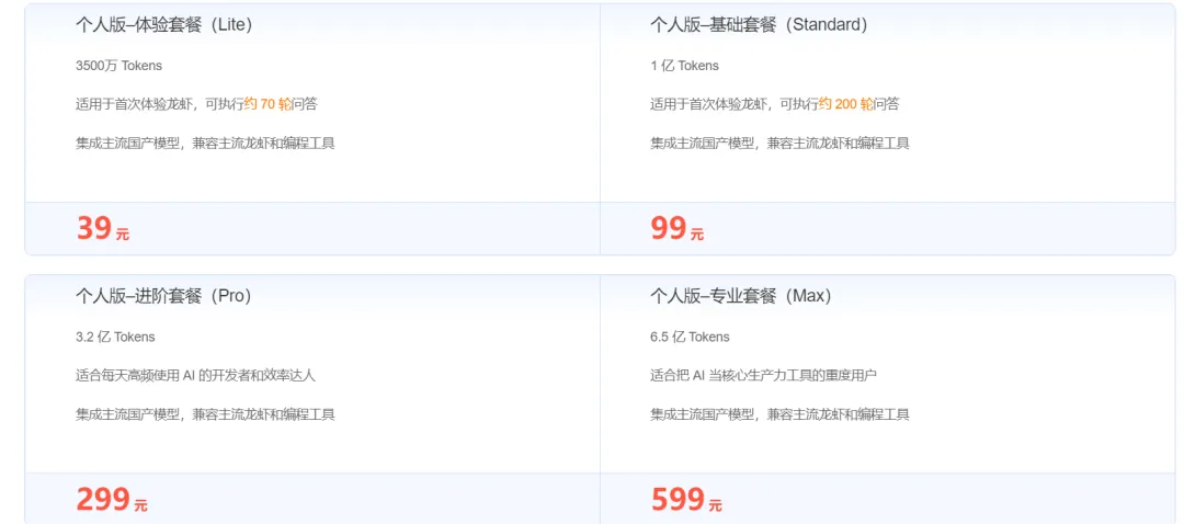 面向龙虾和编程场景设计的专属订阅套餐,覆盖最新国产主流模型、兼容热门龙虾工具和编程工具。