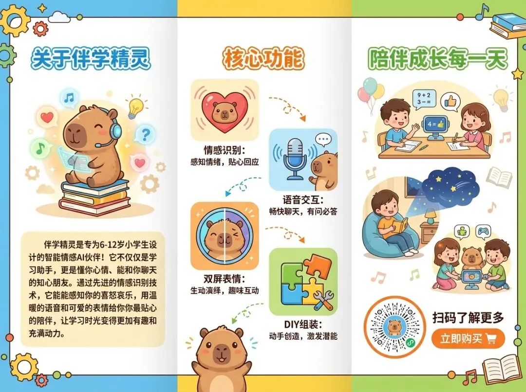 先看样张,我花了3分钟,画了一份卡皮巴拉儿童AI学习机的营销宣传册。