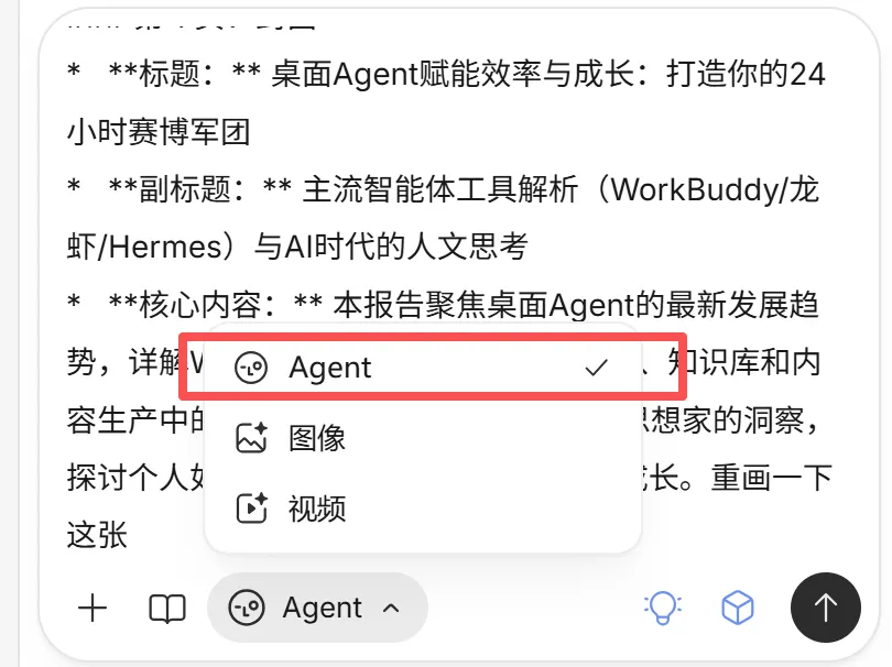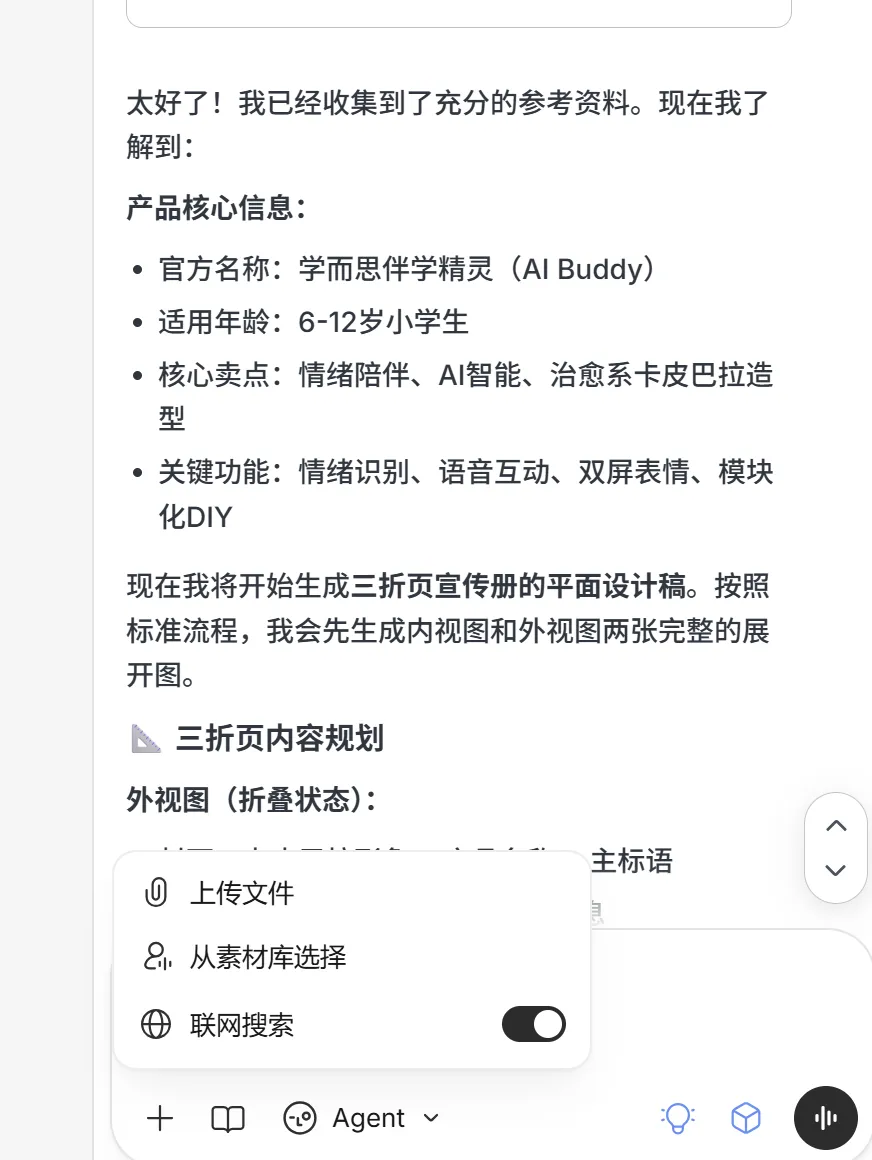 Agent(智能体)则是把多个 Skill 串联起来的自动化流程。一个新品上市Agent,可以自动完成:分析竞品市场,设计品牌视觉体系,生成全渠道适配素材,输出投放文案初稿。你给出目标,它跑完全程,你只管确认结果。