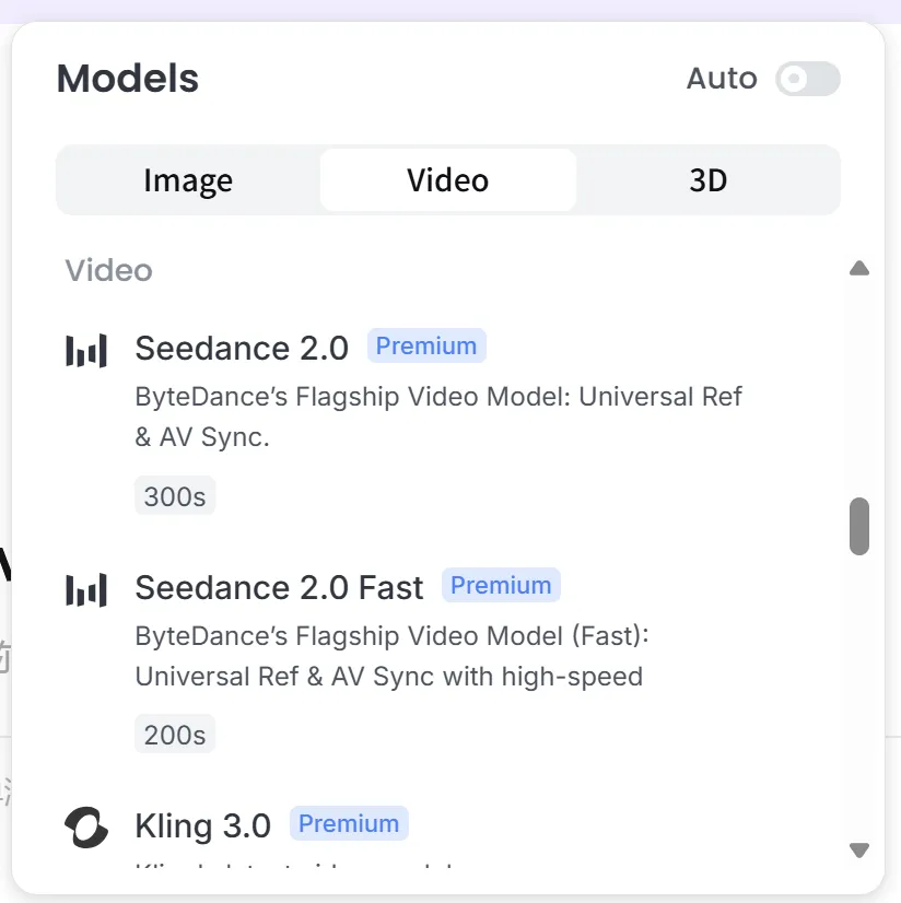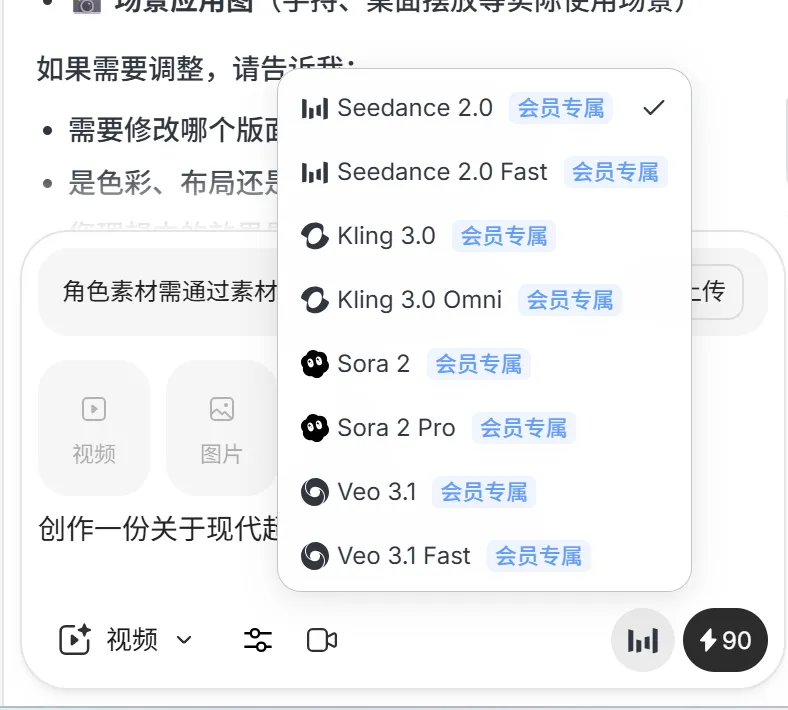 视频生成方面,则是 Sora 2、Veo 3、Kling 2.6 和 Seedance 2.0 的组合。Seedance 2.0 是最新加入的,主打电影感叙事和角色一致性;Kling 2.6 长于运动流畅度;Veo 3 则是 Google 的最新力作。